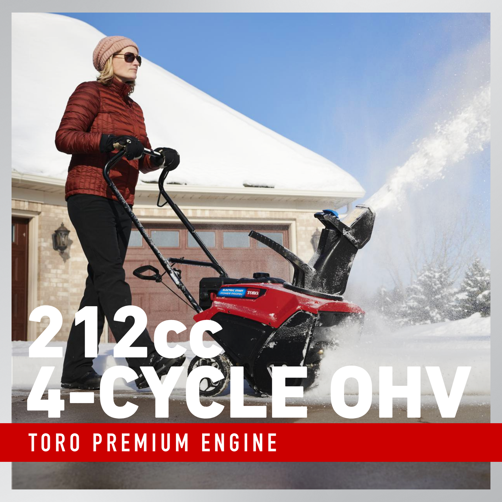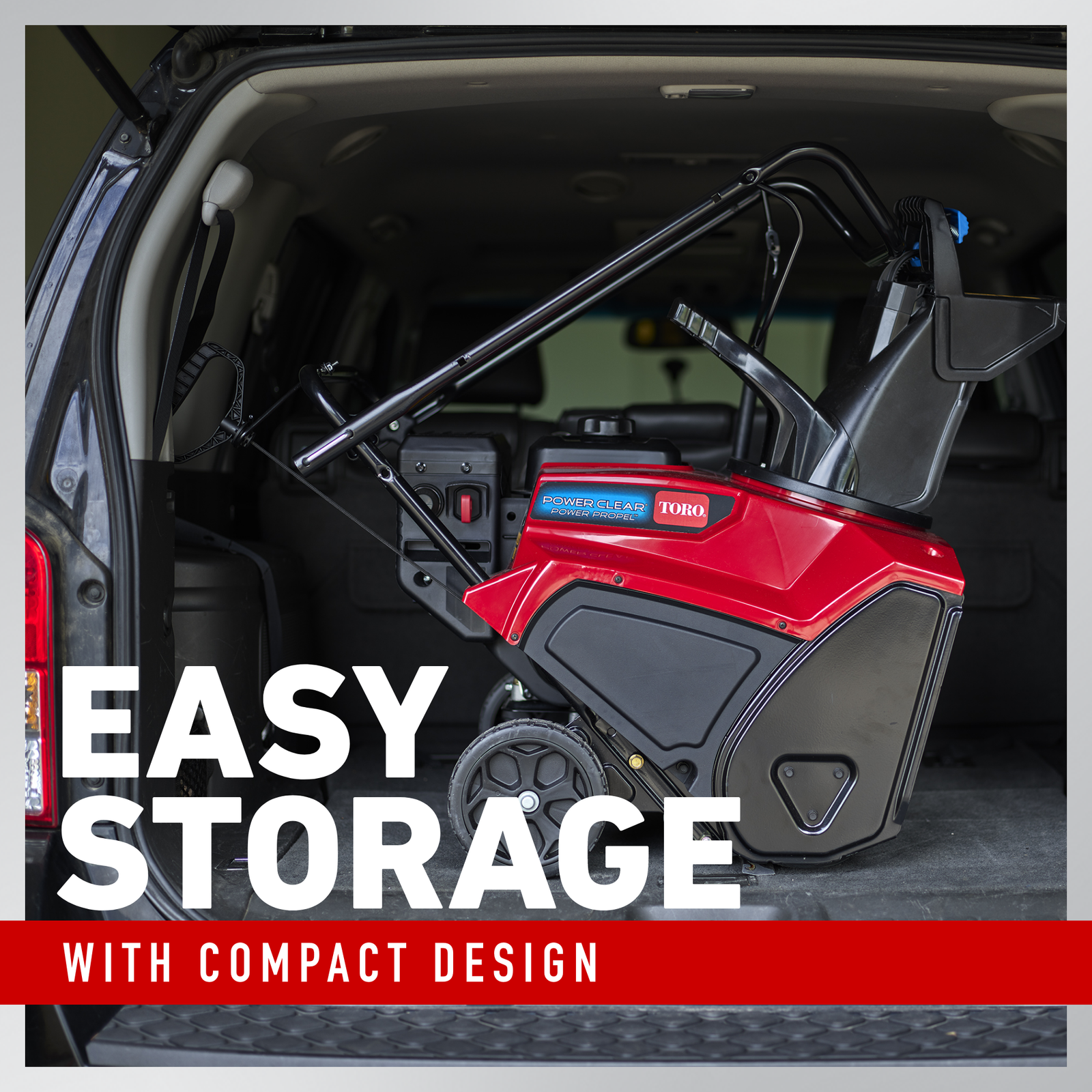 When you’ve got a lot of ground to cover and little time to plow it, the Toro Power Clear 721R gives you the clear edge in speed, quality and convenience. You’ll muscle through the snow in no time and with a throw distance of 35 feet or more with Toro’s powerful 212cc 4-cycle OHV engine. Save your muscles with a commercial-grade ergonomic and enhanced handle, and extended life paddles. And you’ll have minimal clogging with Toro’s Power Curve Technology. And rest easy knowing that Toro stands behind its products with a 2-year full warranty. Count on it.Fold-down handle and chute make storage or transport simple. Storage dimensions: 33 in. x 21 in. x 34 in. (84 cm x 54 cm x 87 cm). Backed by Toro’s Two-Year Full Warranty and Two-Year Guaranteed to Start Warranty (Residential only) or 1-Year Limited Warranty (Commercial) (No GTS Warranty for Commercial Use).Choose the right fuelfor your snowblower. For best starting results use Non-ethanol fuel with an octane rating of 87 or higher. Use fresh fuel less than 30 days old, add fuel stabilizer to reduce starting problems. Do not mix oil with gas. For more information, view ourFuel Fact Tips.