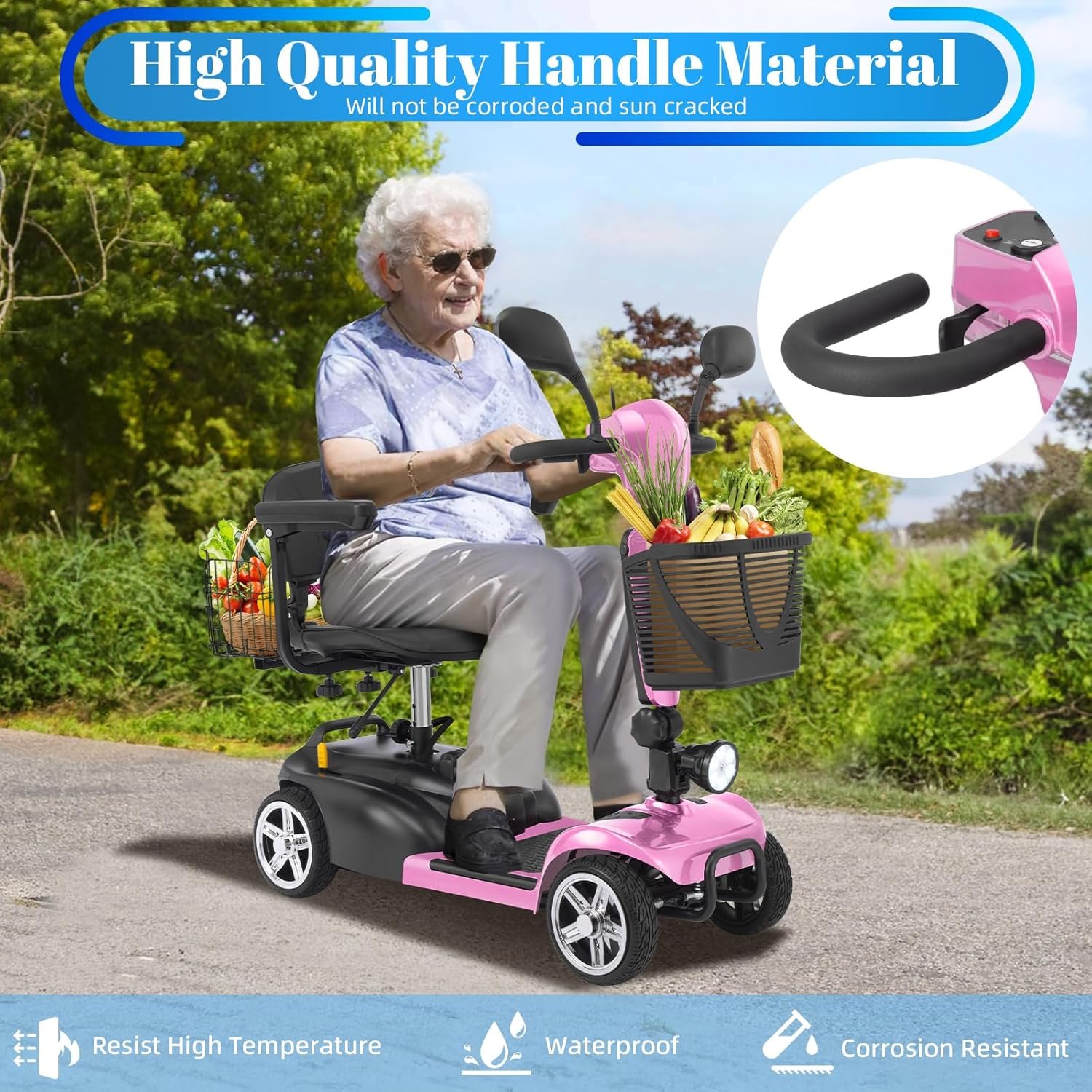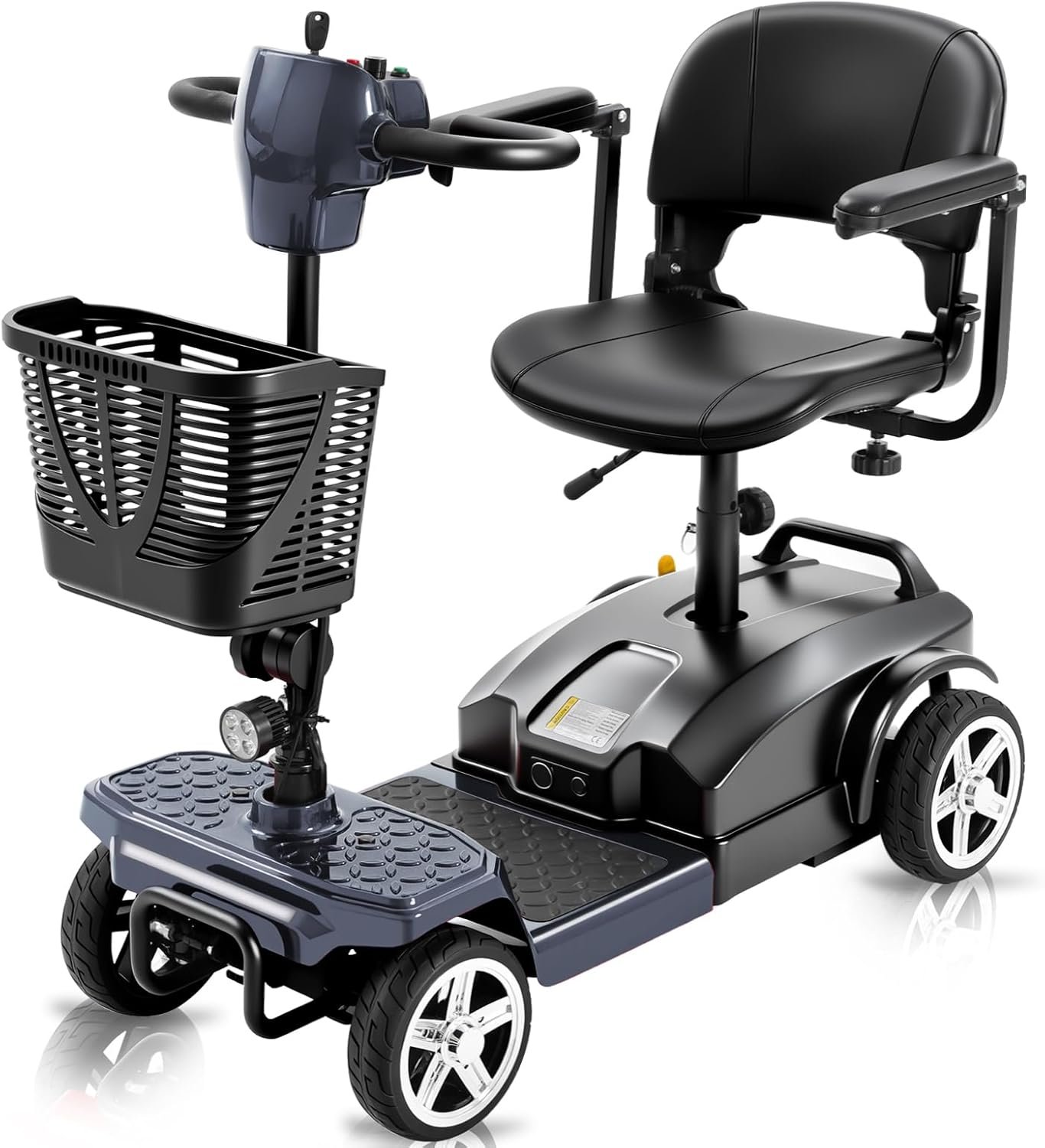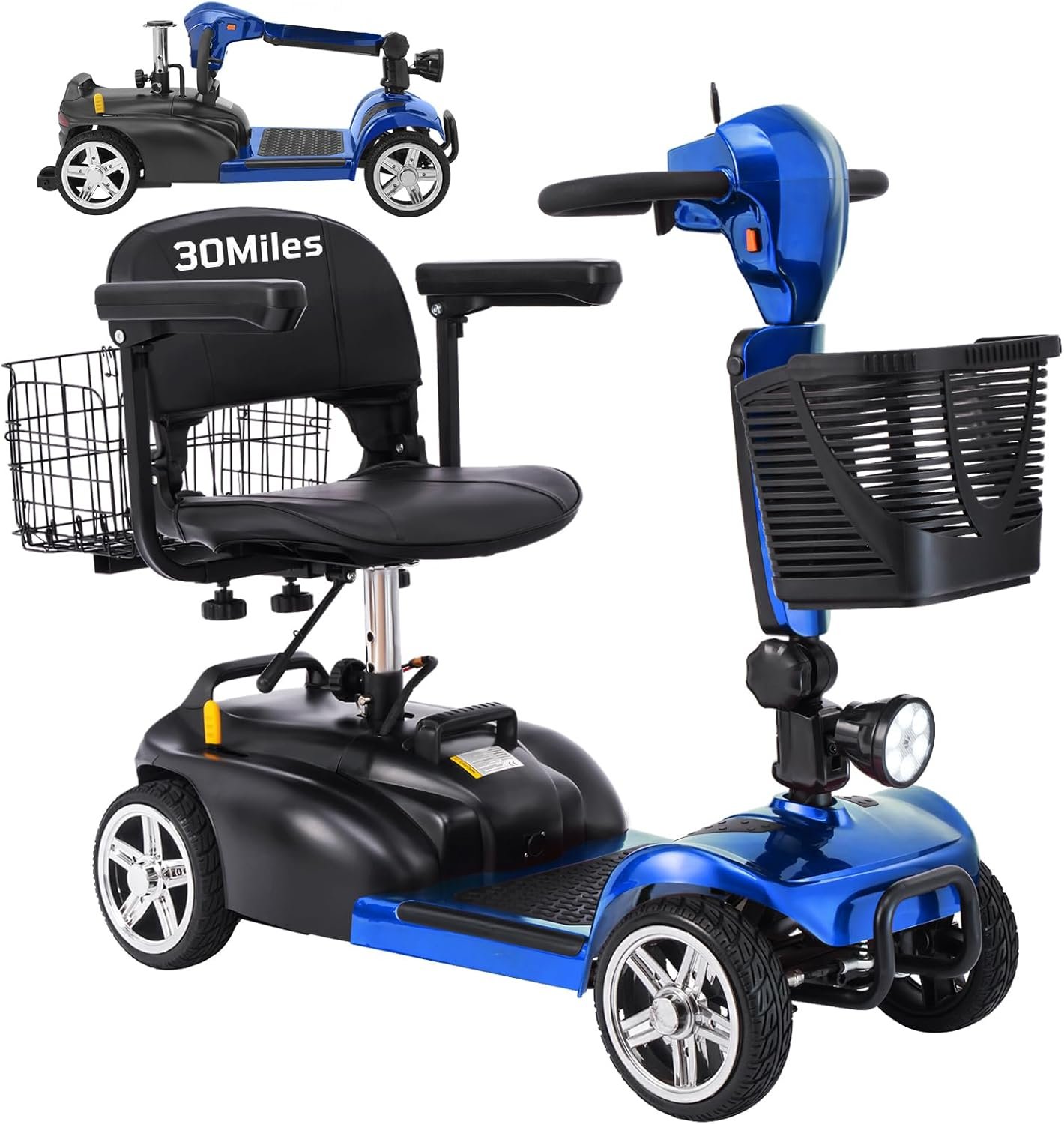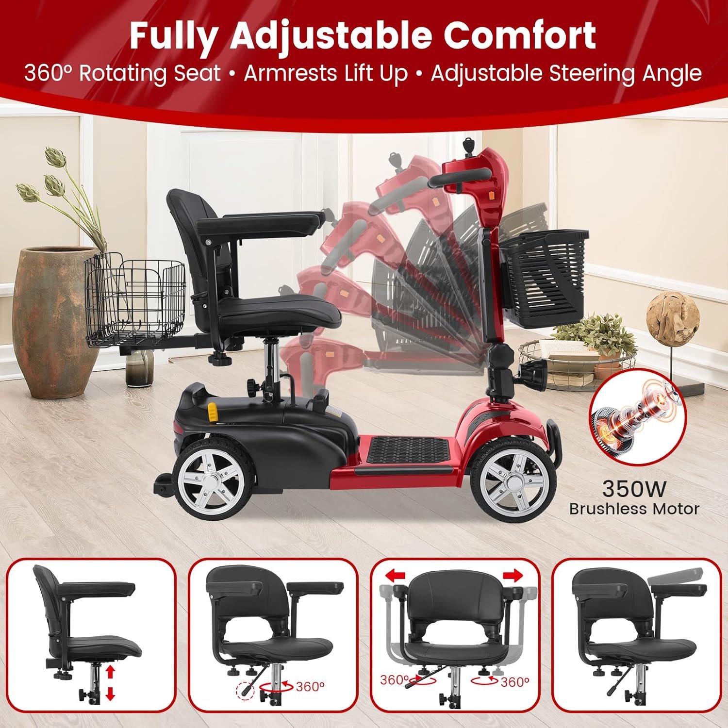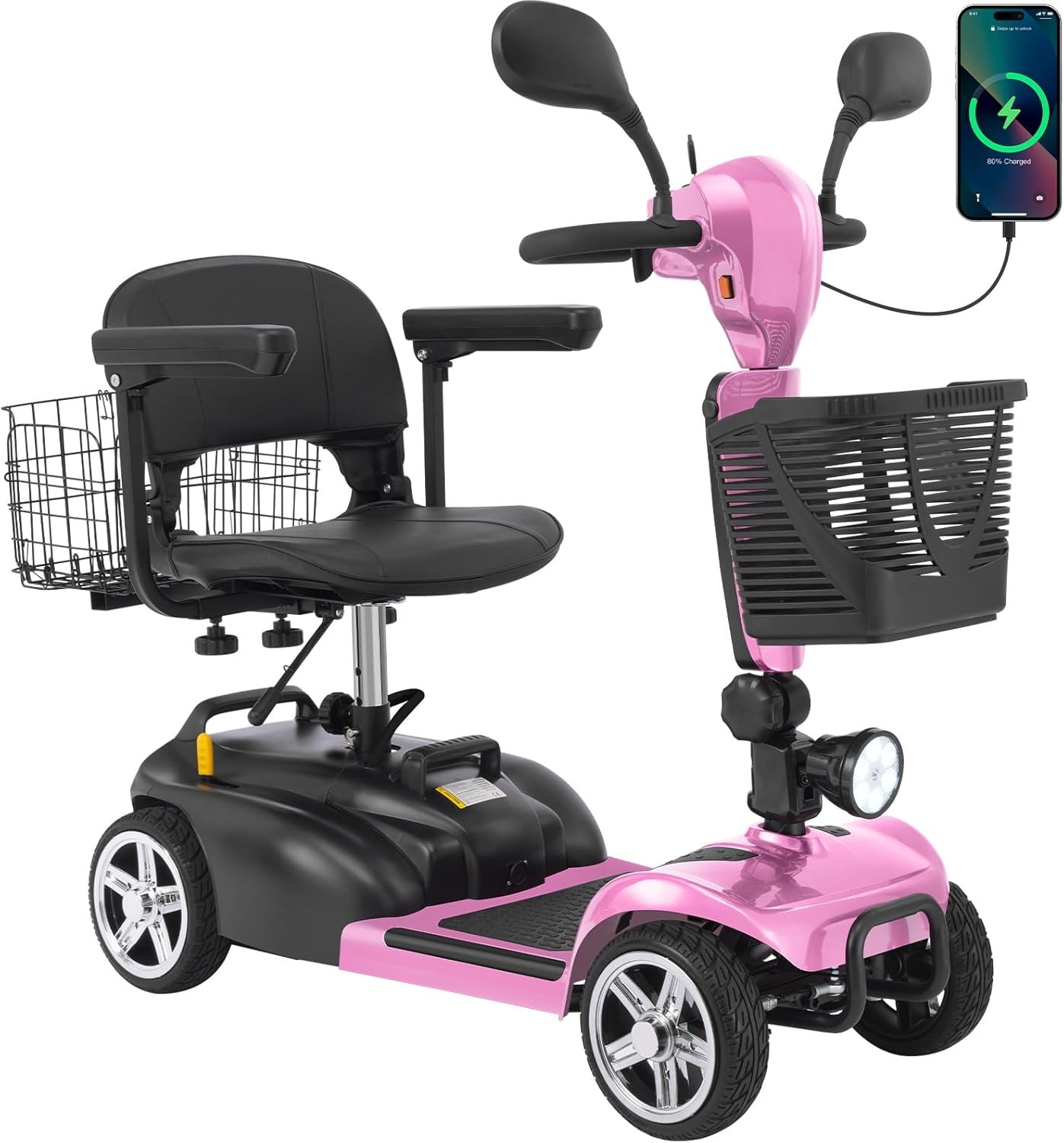 Foldable & Portable 4-Piece Design: Disassembles into 4 lightweight pieces for easy transport and storage. Foldable tiller, 360° rotating seat, and detachable front/rear baskets make it perfect for car trunks, closets, or small spaces.