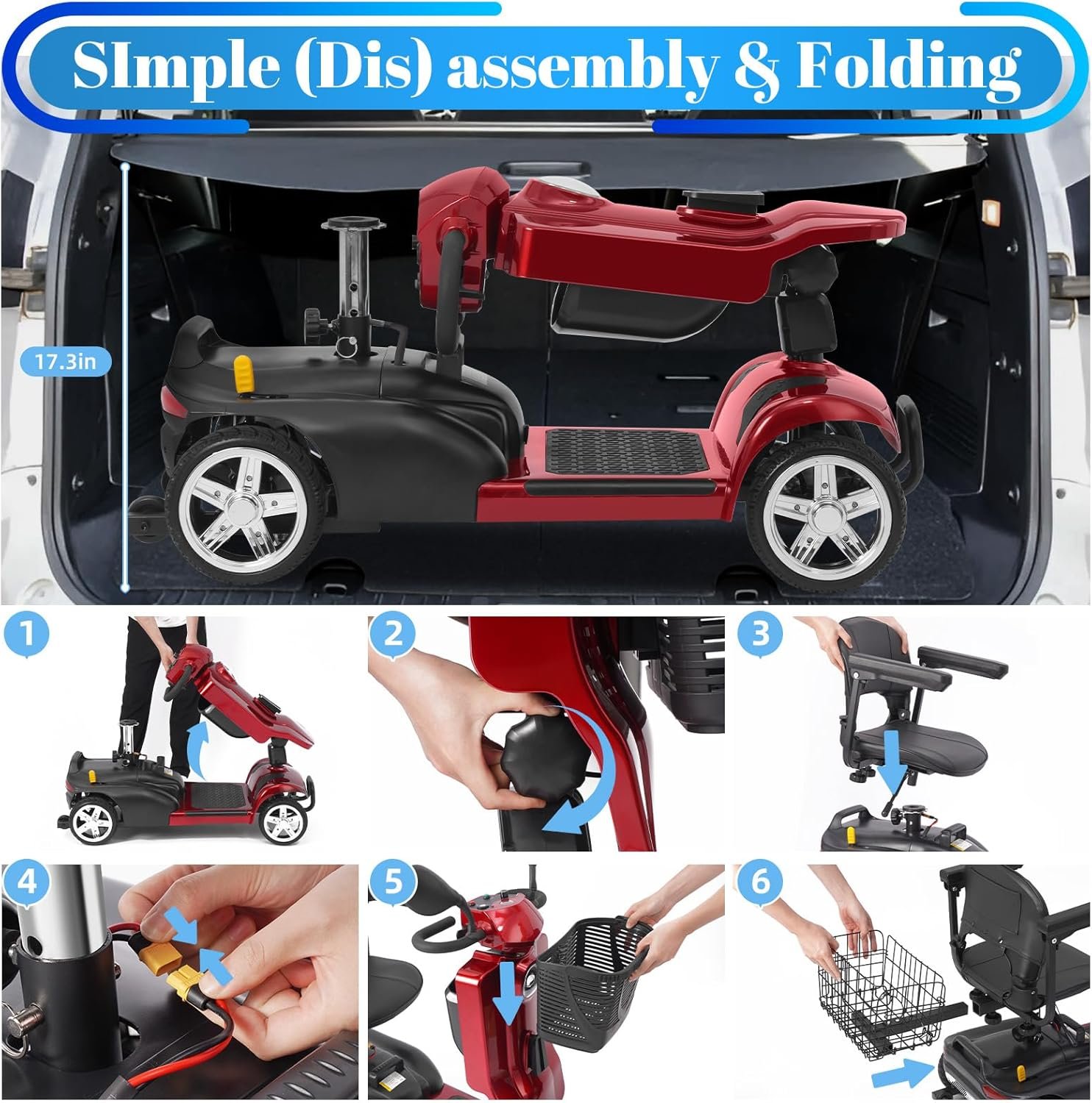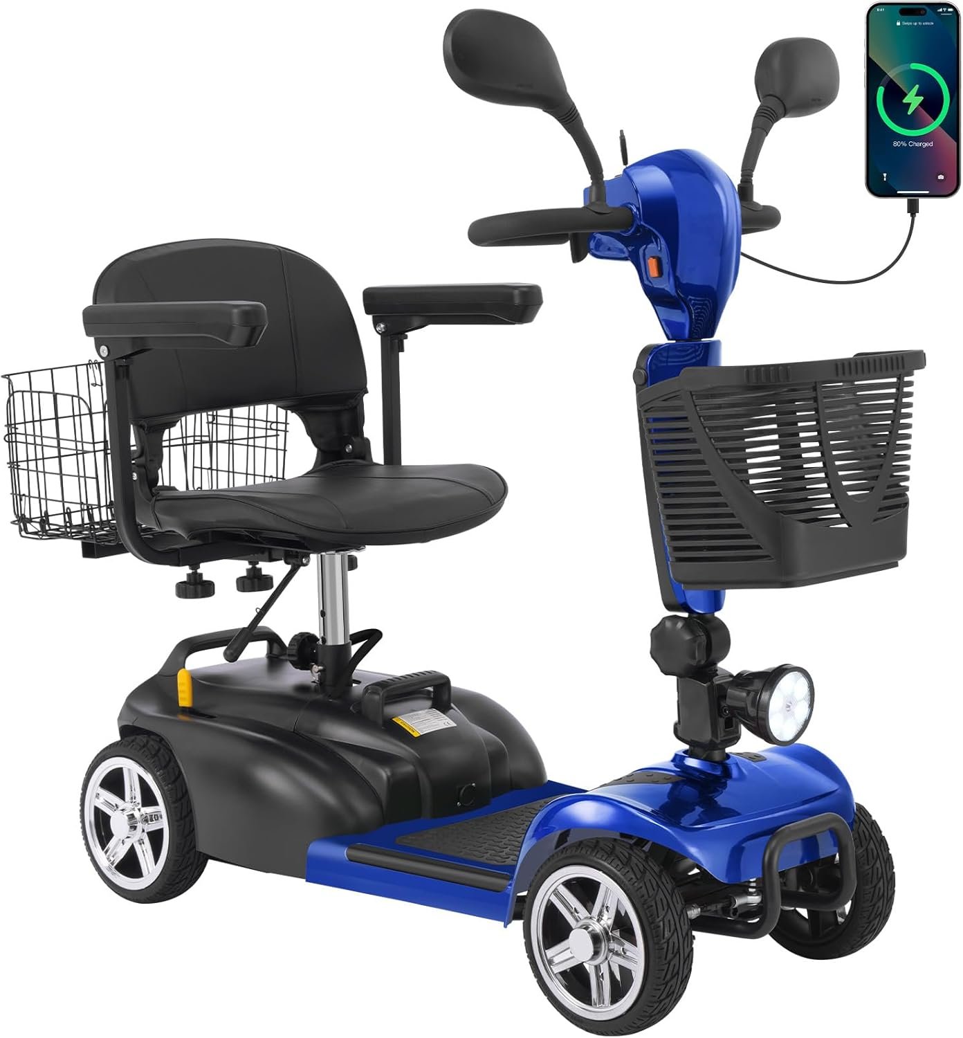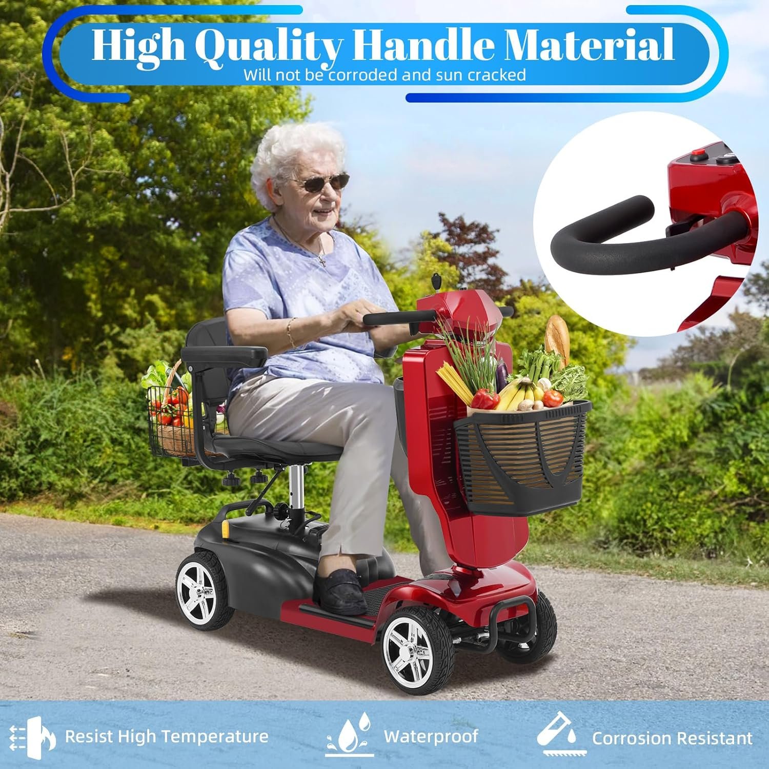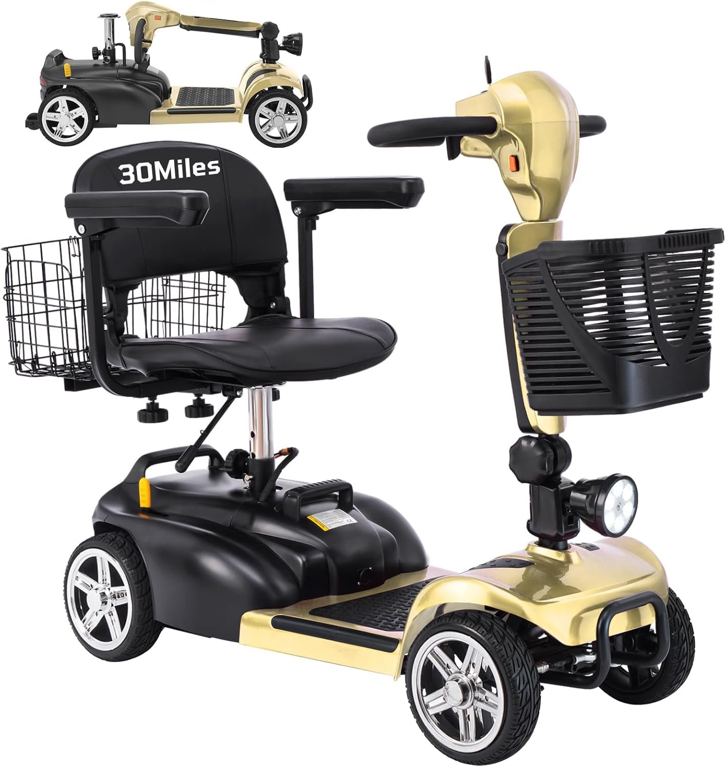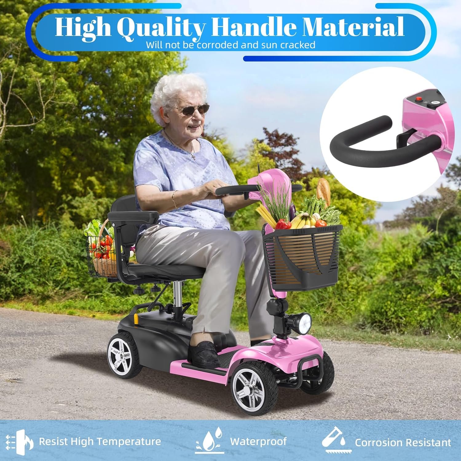 Foldable & Portable 4-Piece Design: Disassembles into 4 lightweight pieces for easy transport and storage. Foldable tiller, 360° rotating seat, and detachable front/rear baskets make it perfect for car trunks, closets, or small spaces.