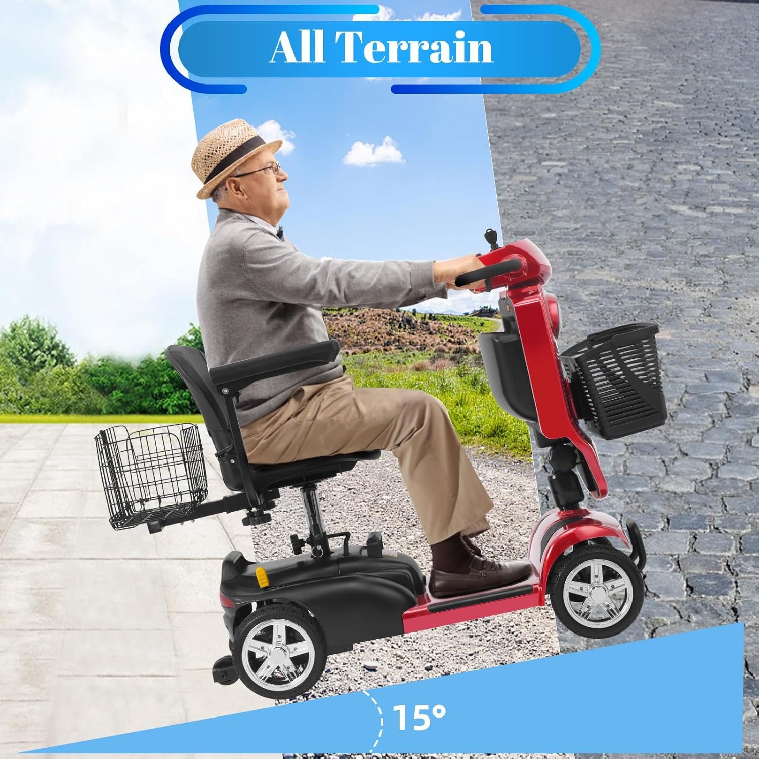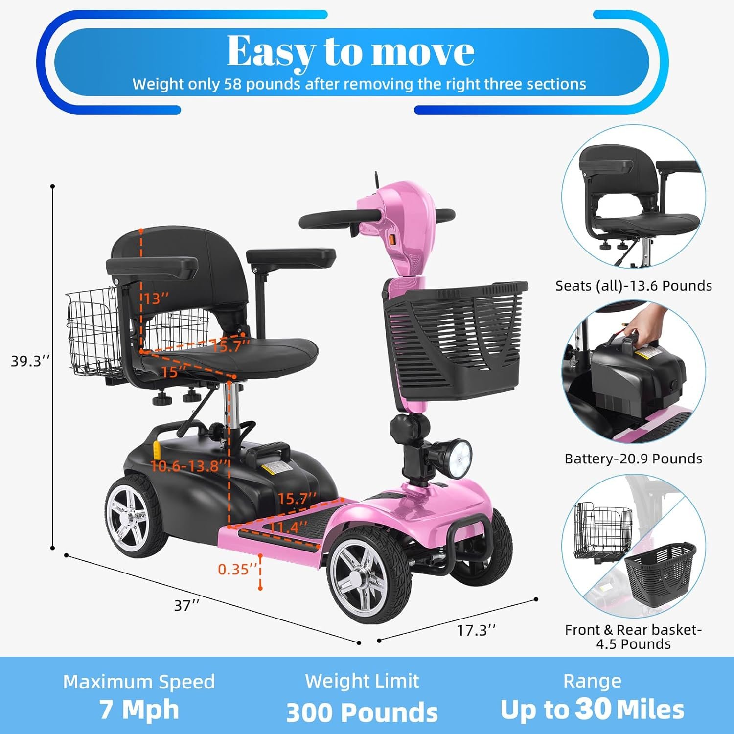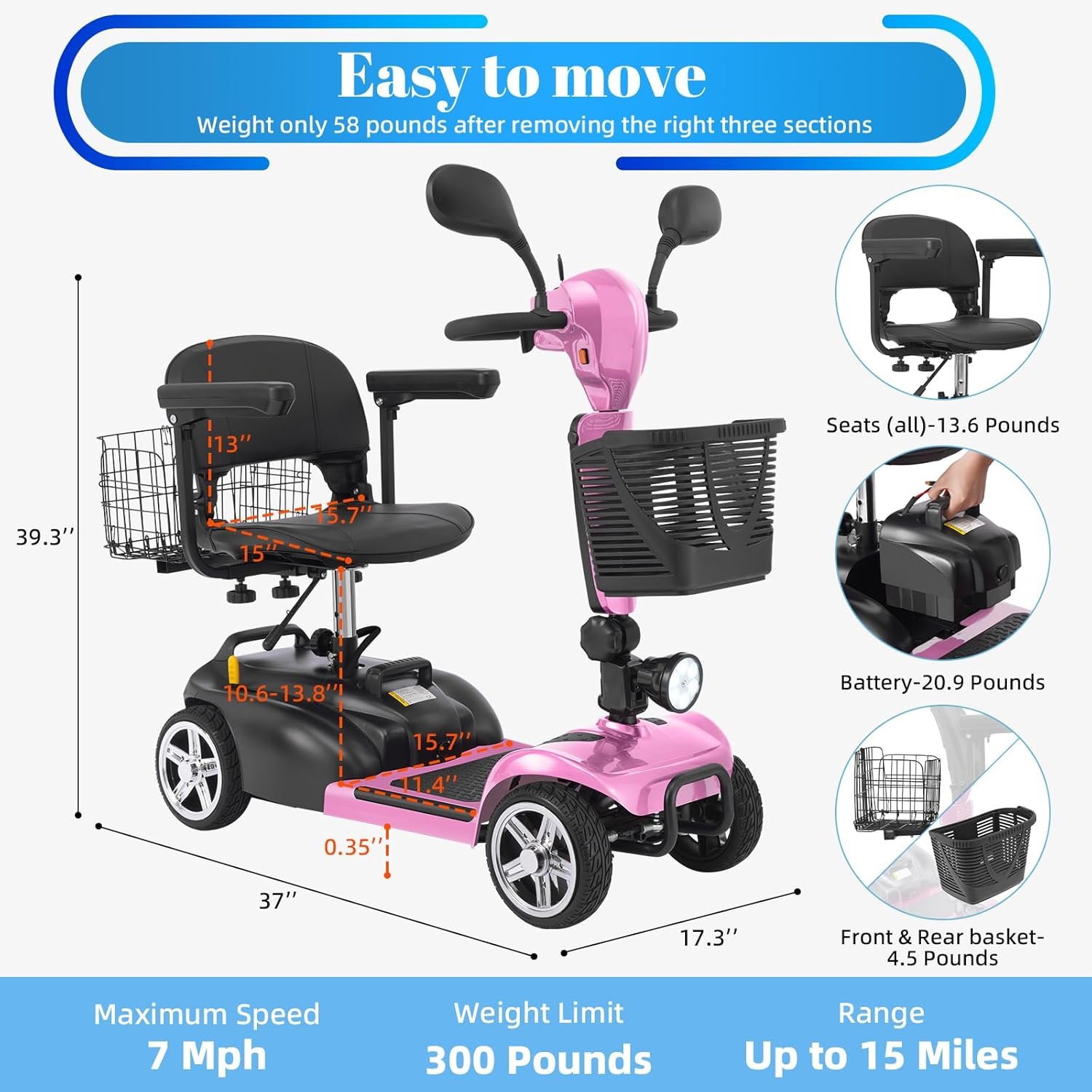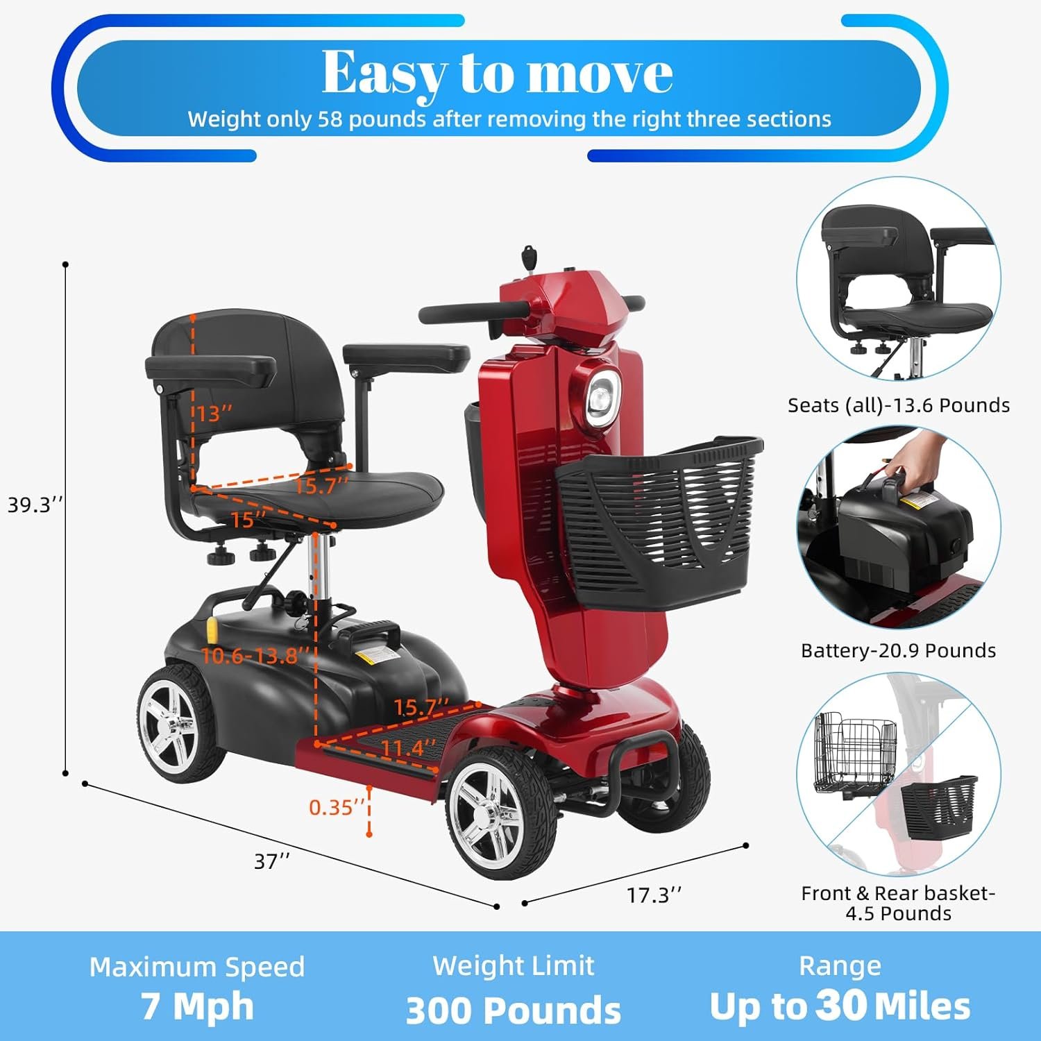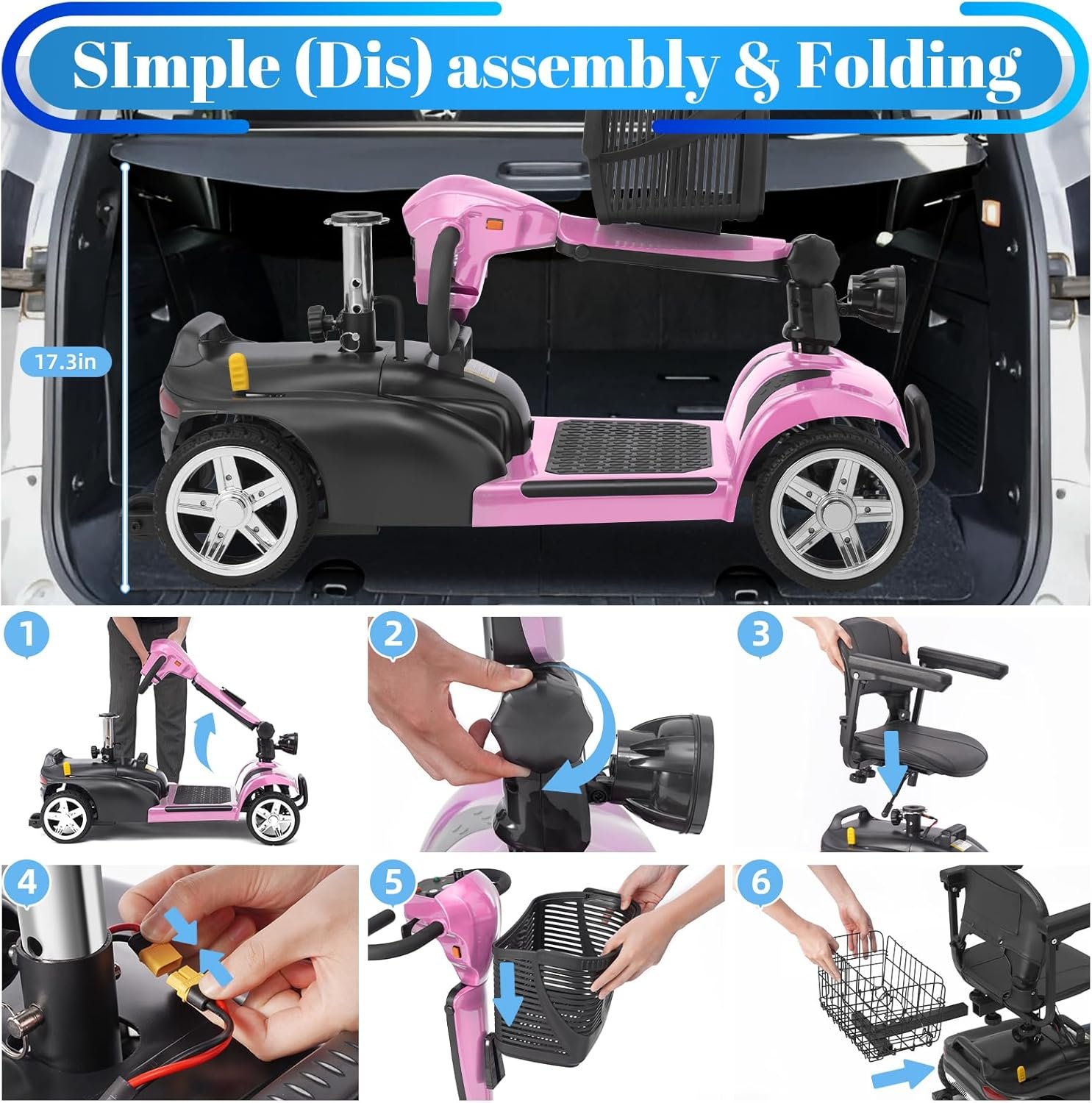 Foldable & Portable 4-Piece Design: Disassembles into 4 lightweight pieces for easy transport and storage. Foldable tiller, 360° rotating seat, and detachable front/rear baskets make it perfect for car trunks, closets, or small spaces.