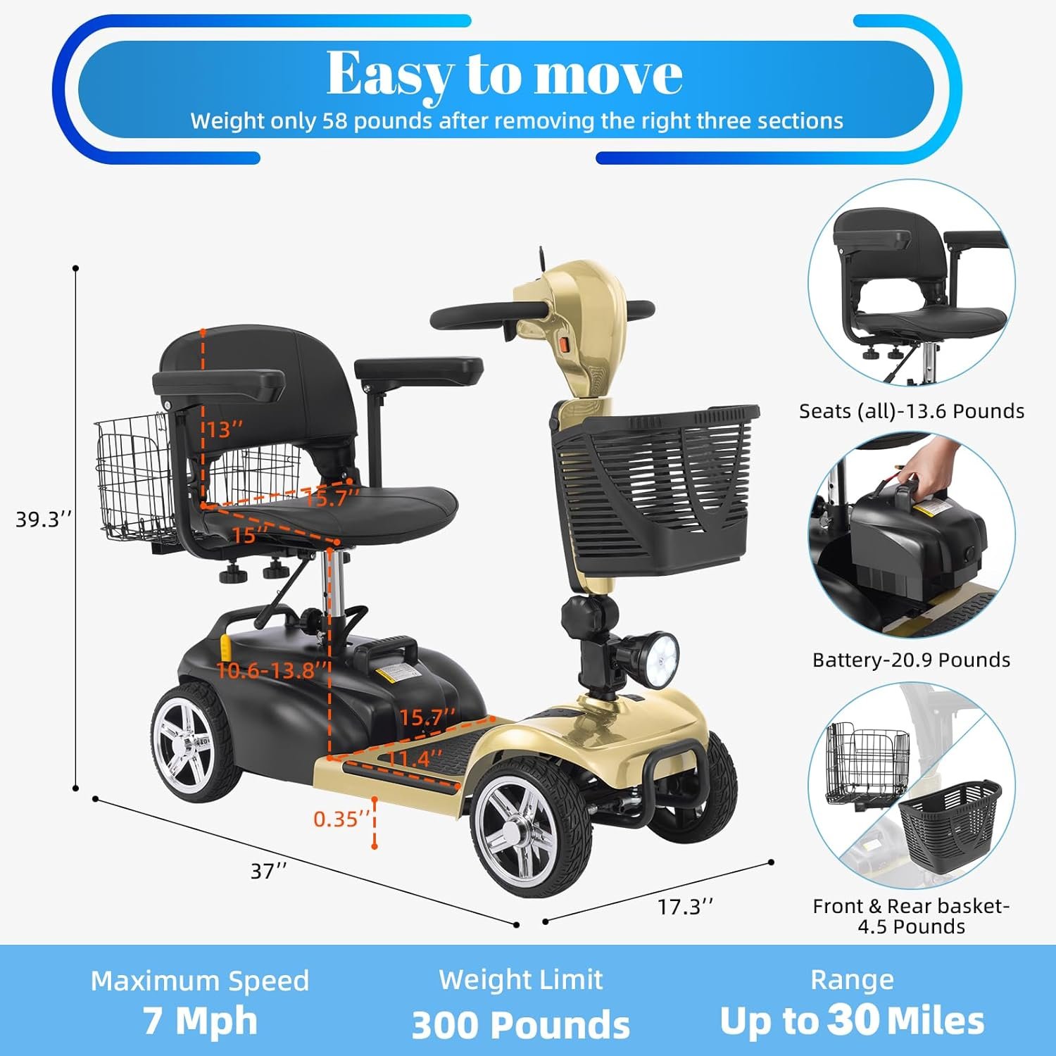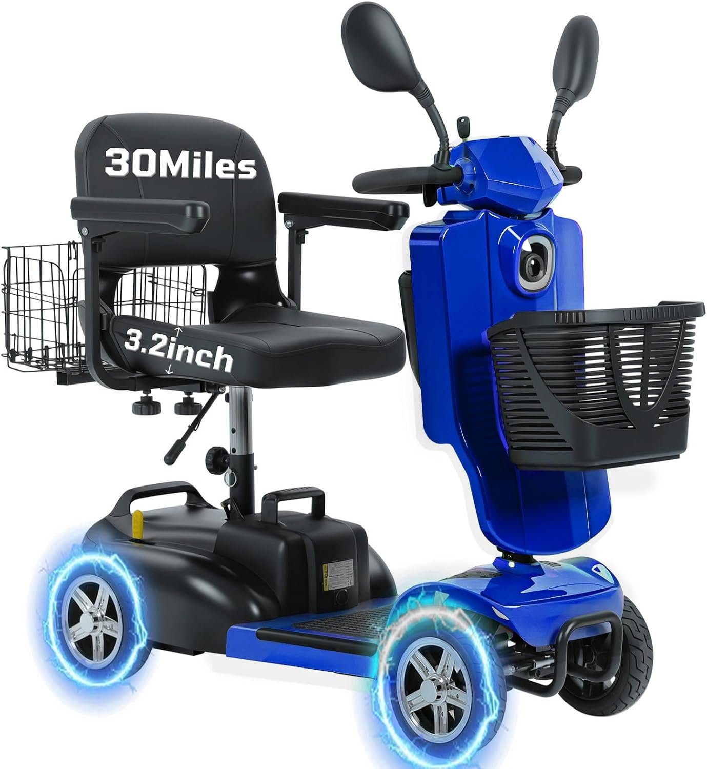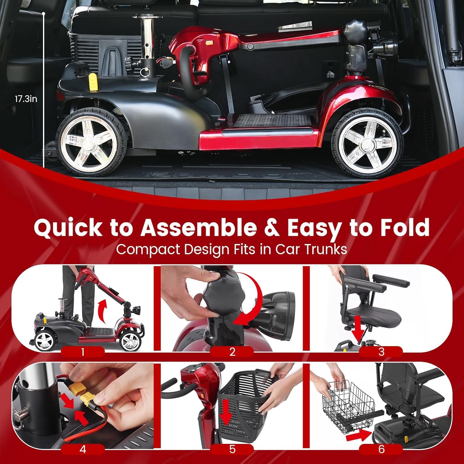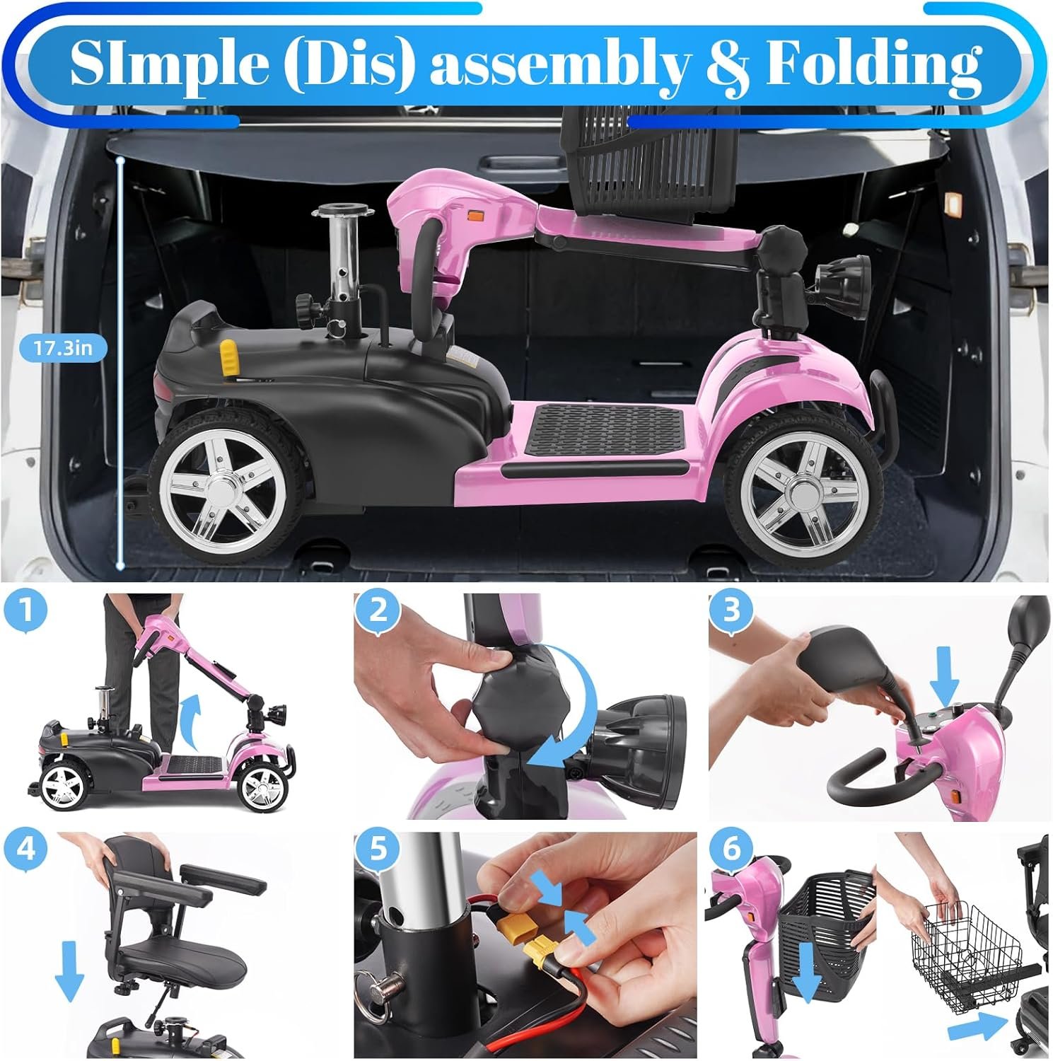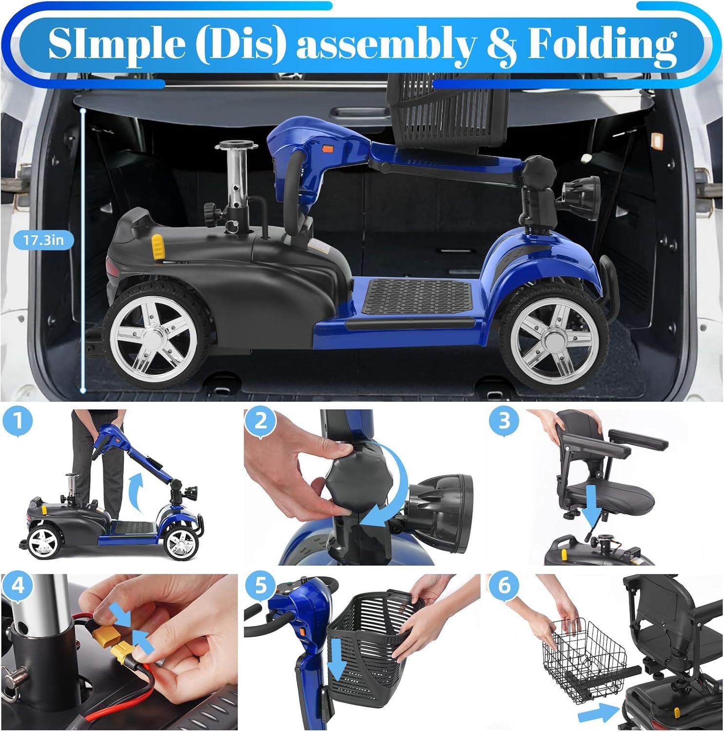 Foldable & Portable 4-Piece Design: Disassembles into 4 lightweight pieces for easy transport and storage. Foldable tiller, 360° rotating seat, and detachable front/rear baskets make it perfect for car trunks, closets, or small spaces.