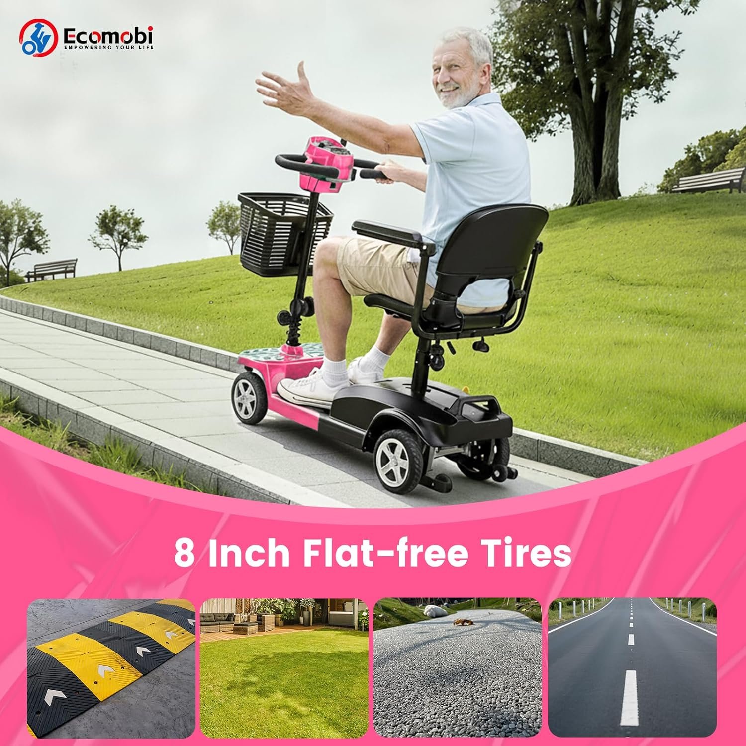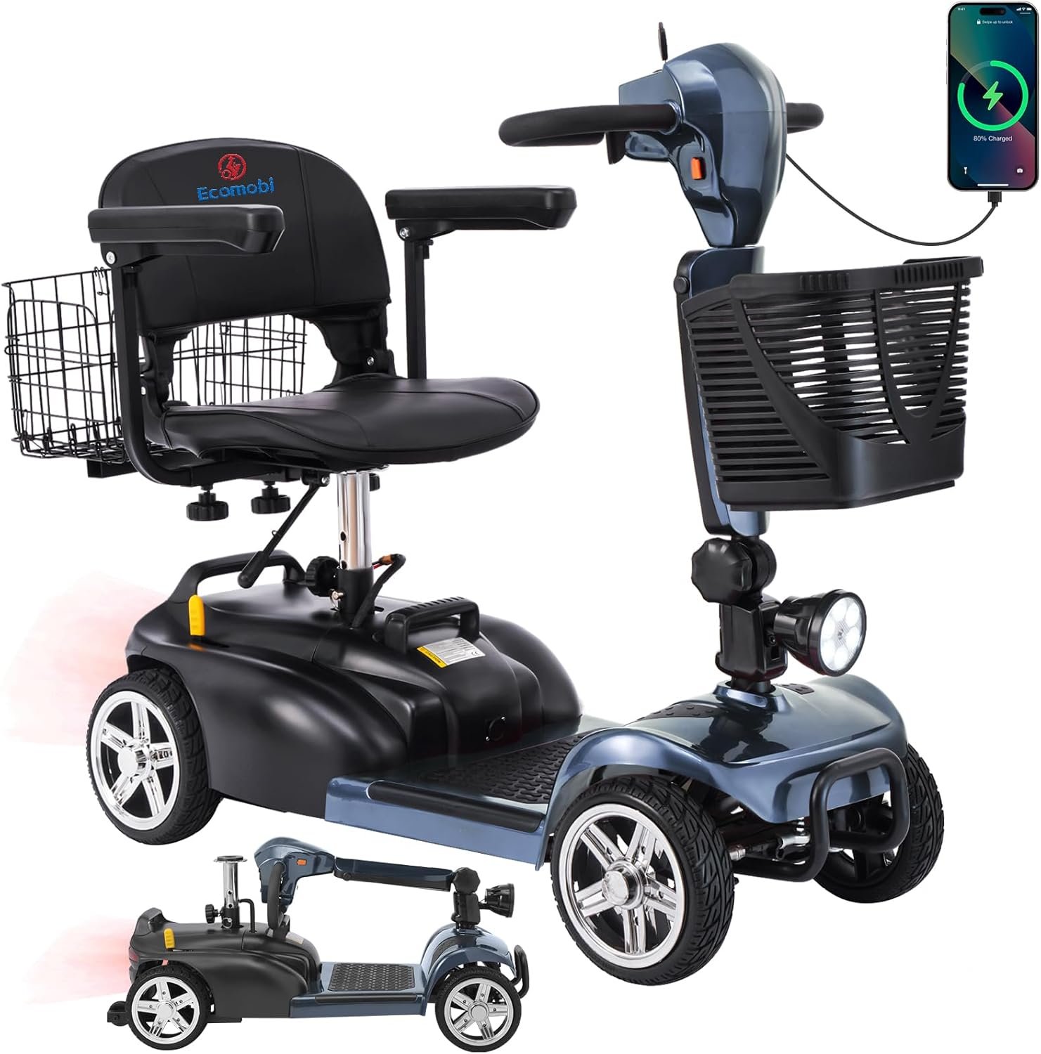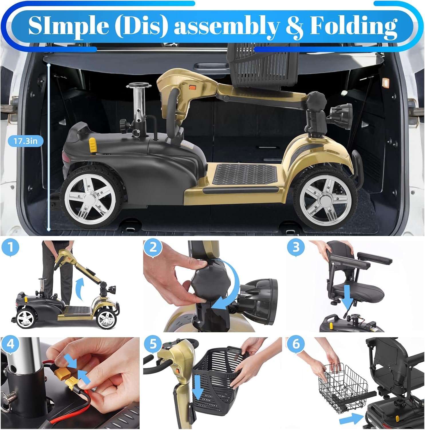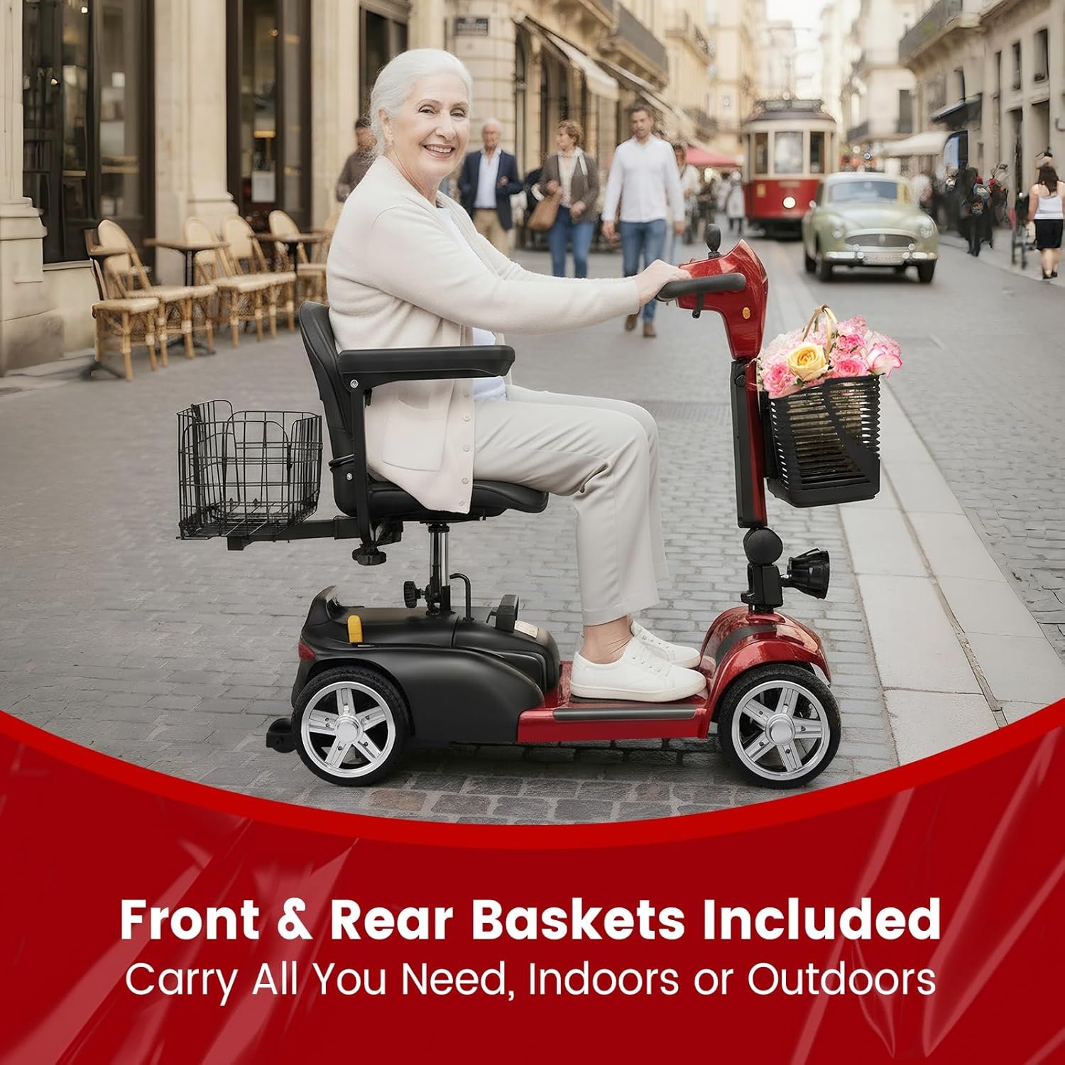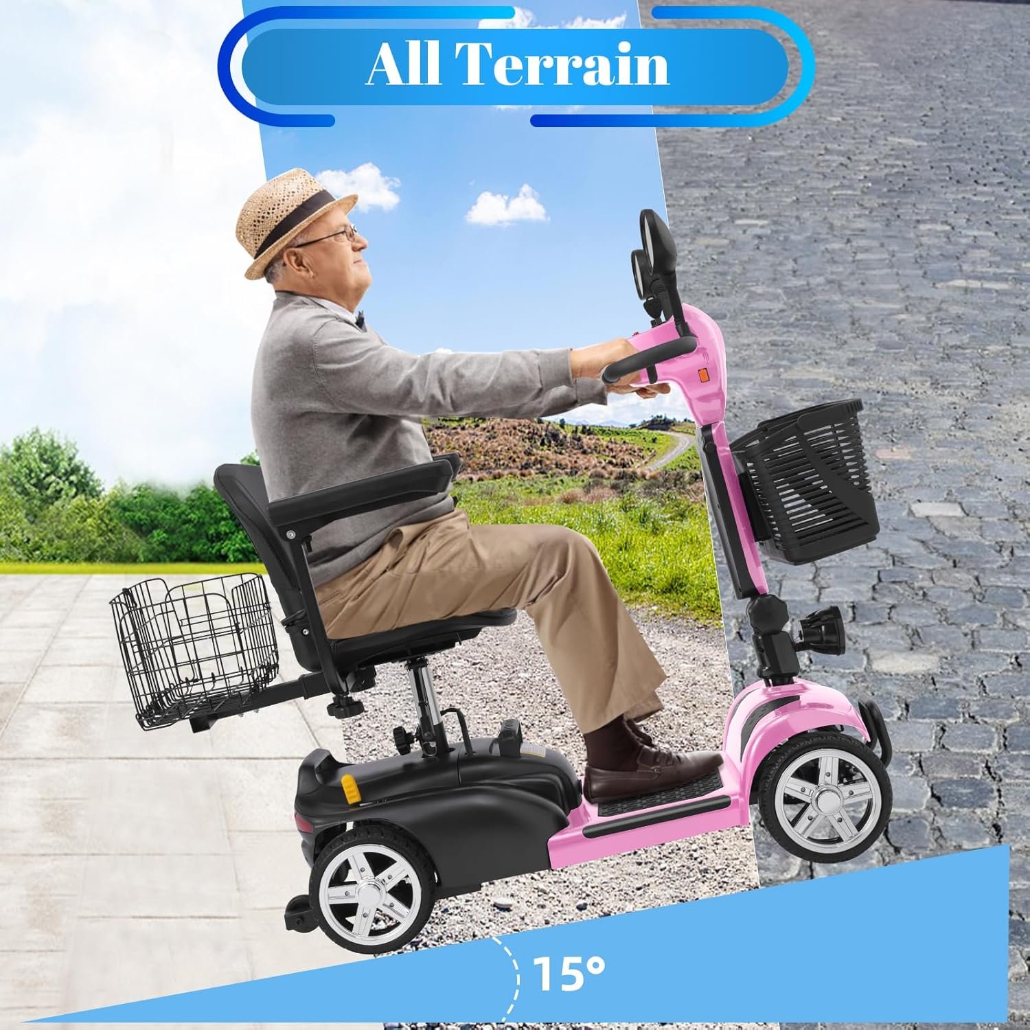 Foldable & Portable 4-Piece Design: Disassembles into 4 lightweight pieces for easy transport and storage. Foldable tiller, 360° rotating seat, and detachable front/rear baskets make it perfect for car trunks, closets, or small spaces.