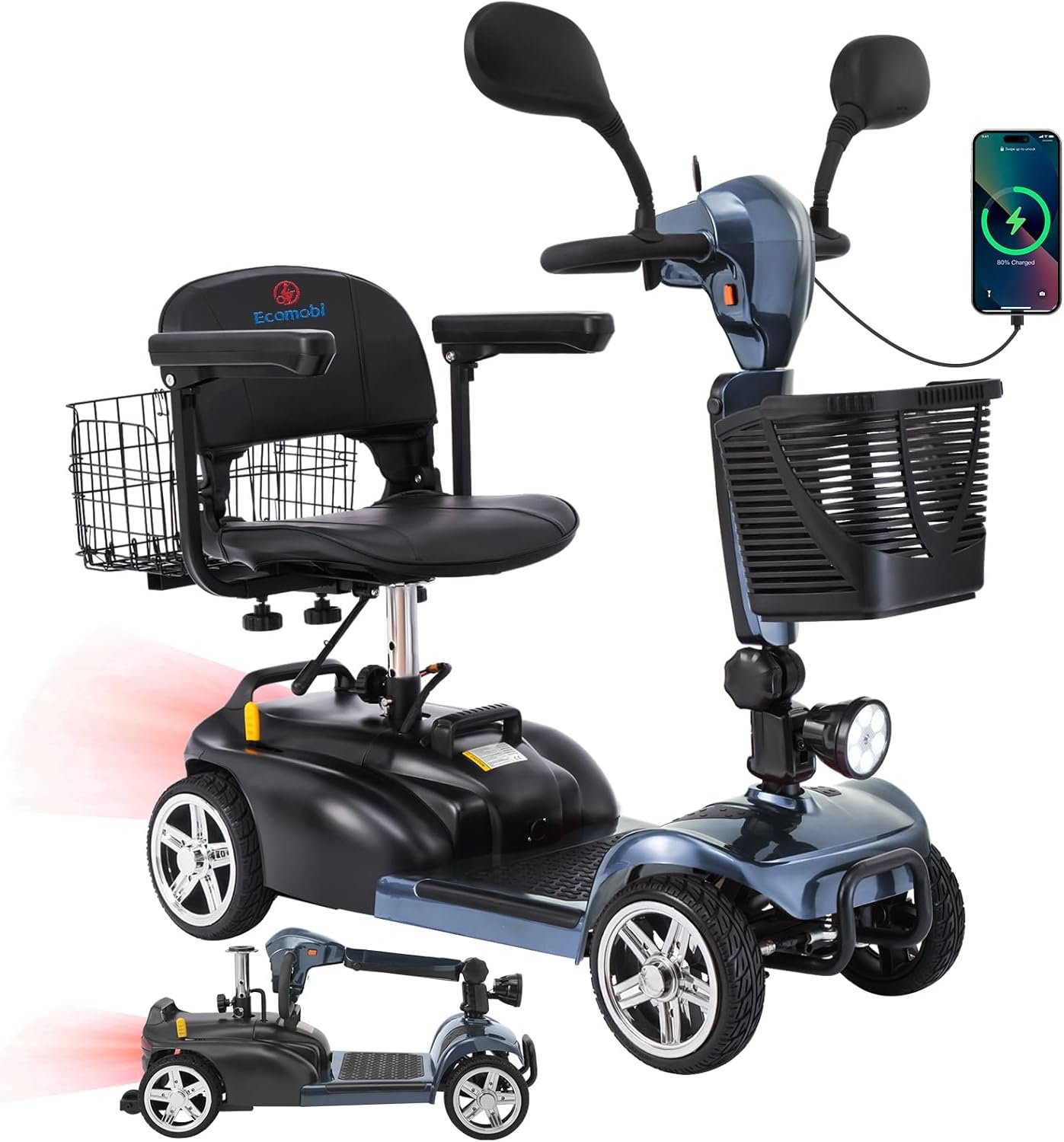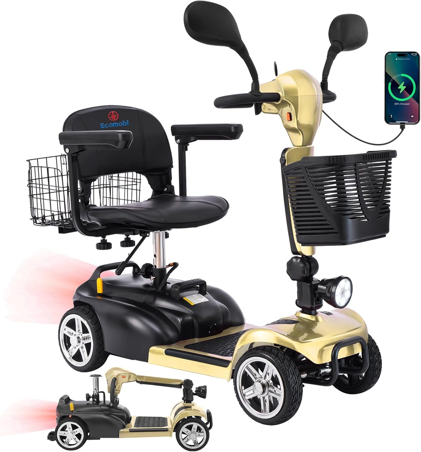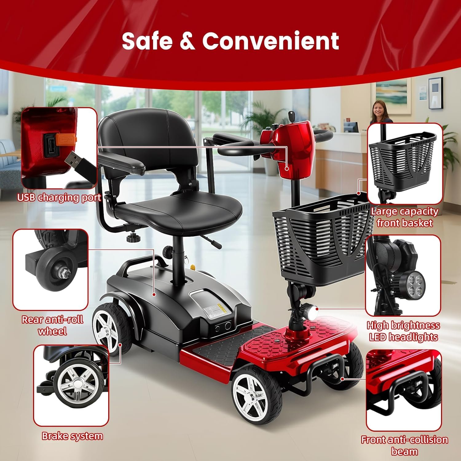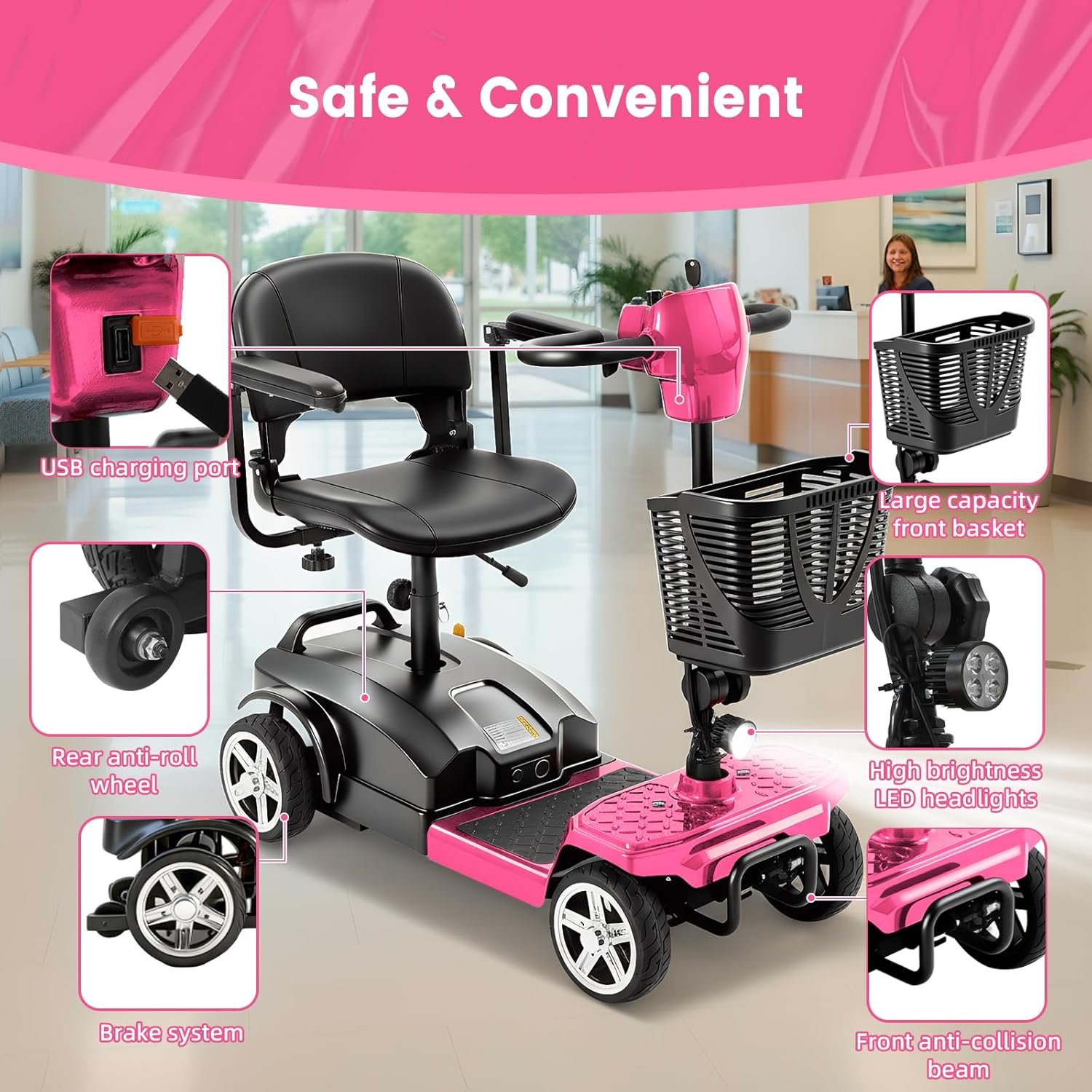 All-Day Comfort & Safety: Features height-adjustable rotating seat, pivoting armrests, front anti-collision bar, rear anti-tip wheels, front LED light, and rearview mirrors.