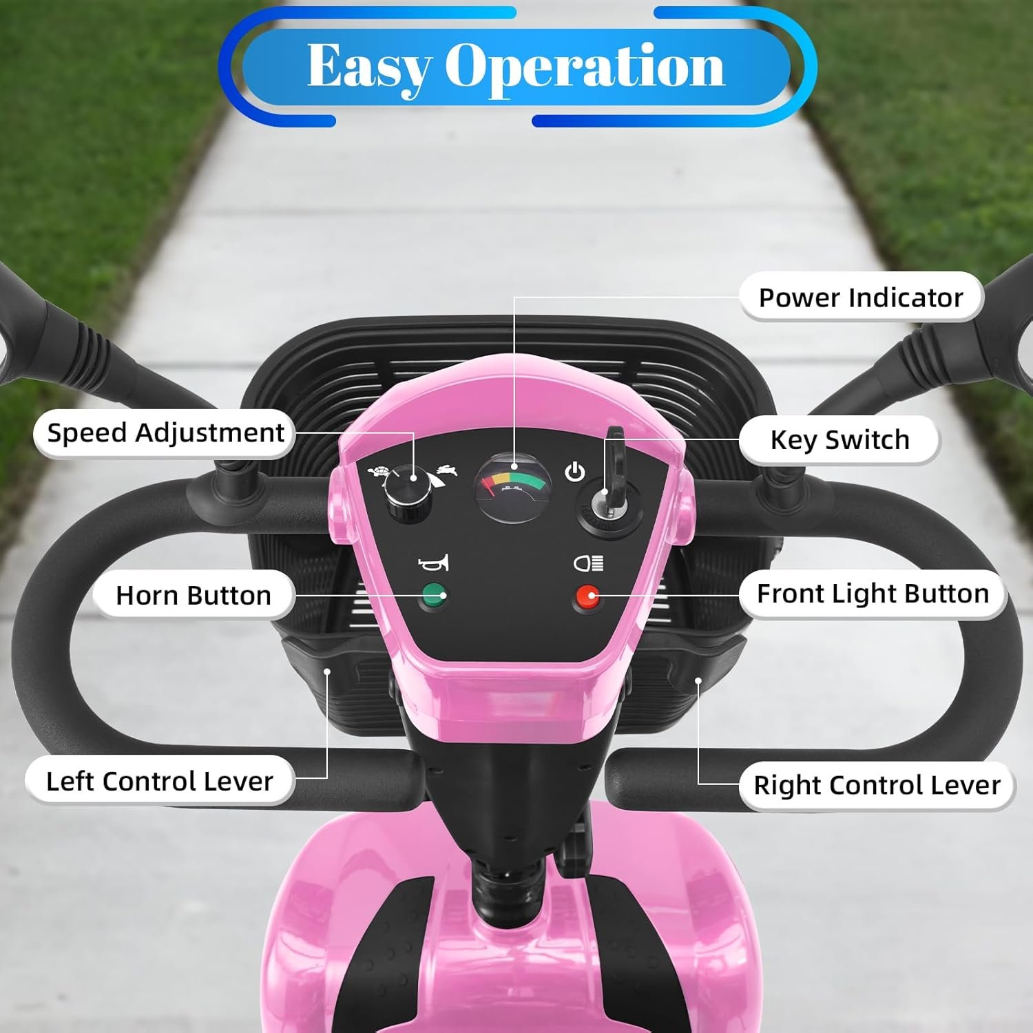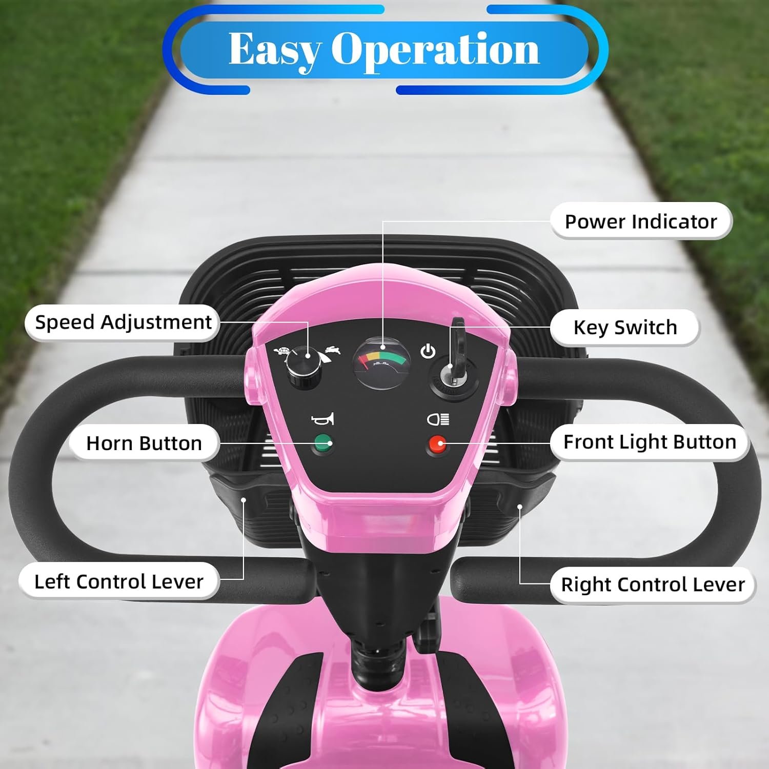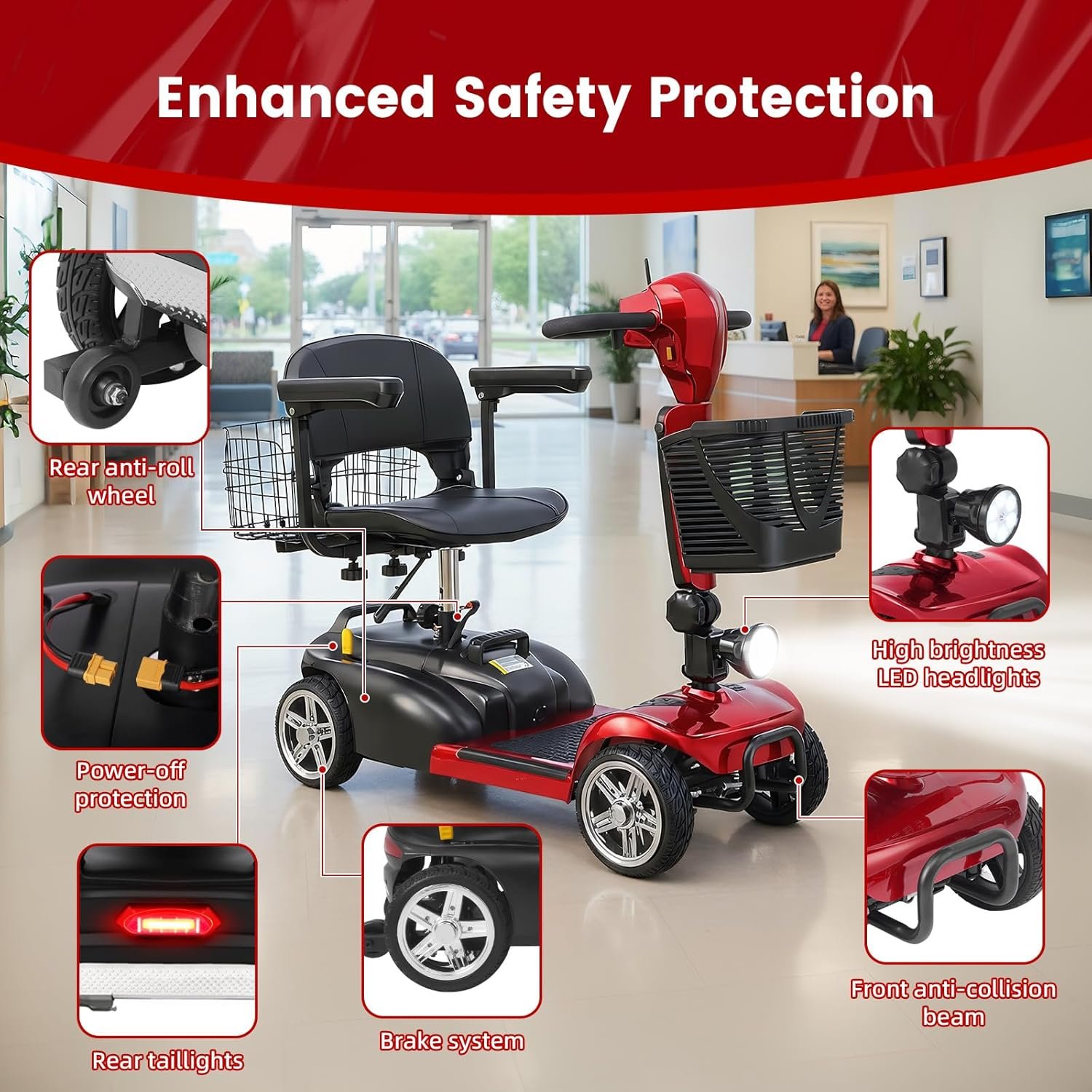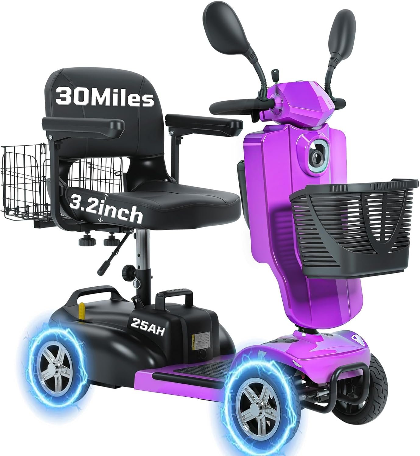All-Day Comfort & Safety: Features height-adjustable rotating seat, pivoting armrests, front anti-collision bar, rear anti-tip wheels, front LED light, and rearview mirrors.