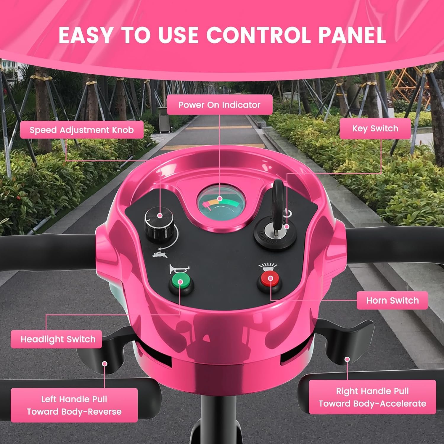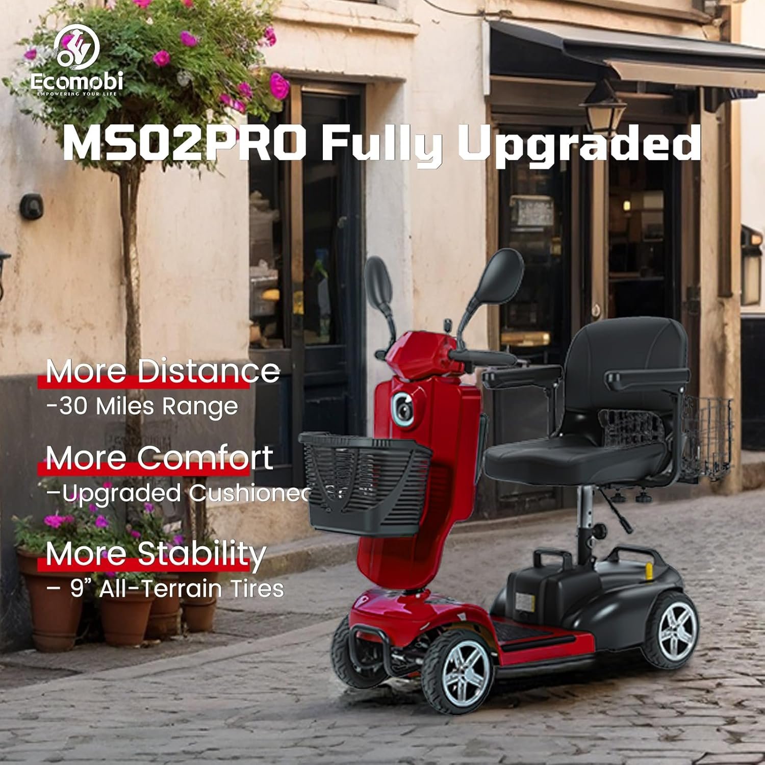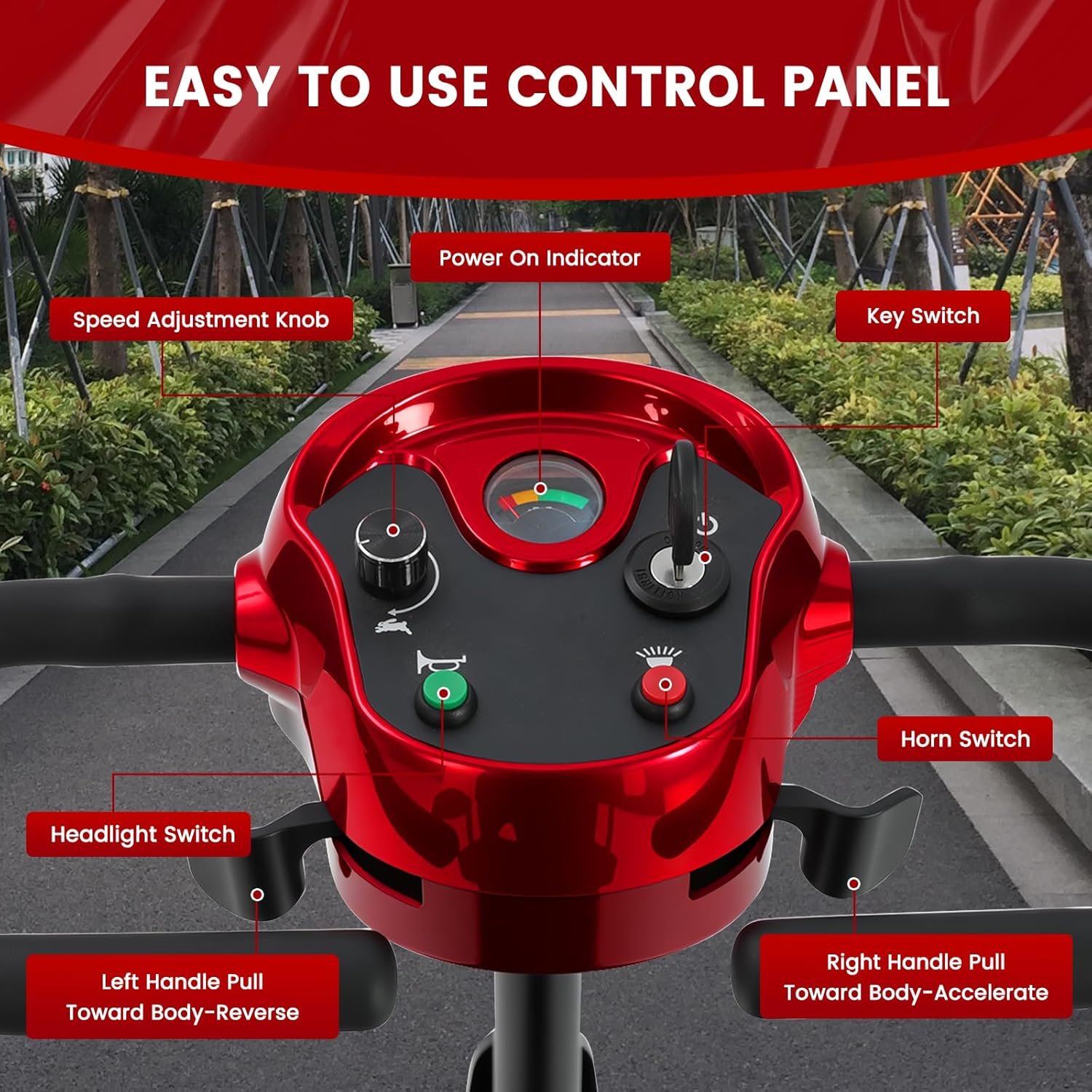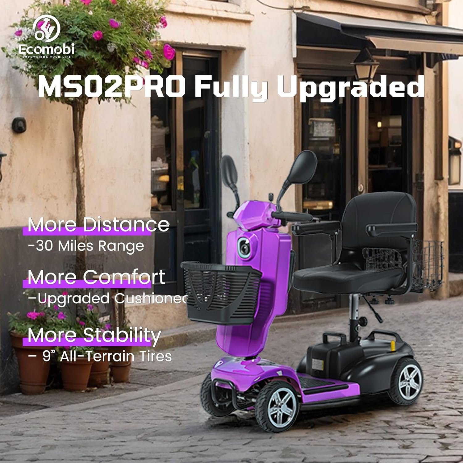 All-Day Comfort & Safety: Features height-adjustable rotating seat, pivoting armrests, front anti-collision bar, rear anti-tip wheels, front LED light, and rearview mirrors.