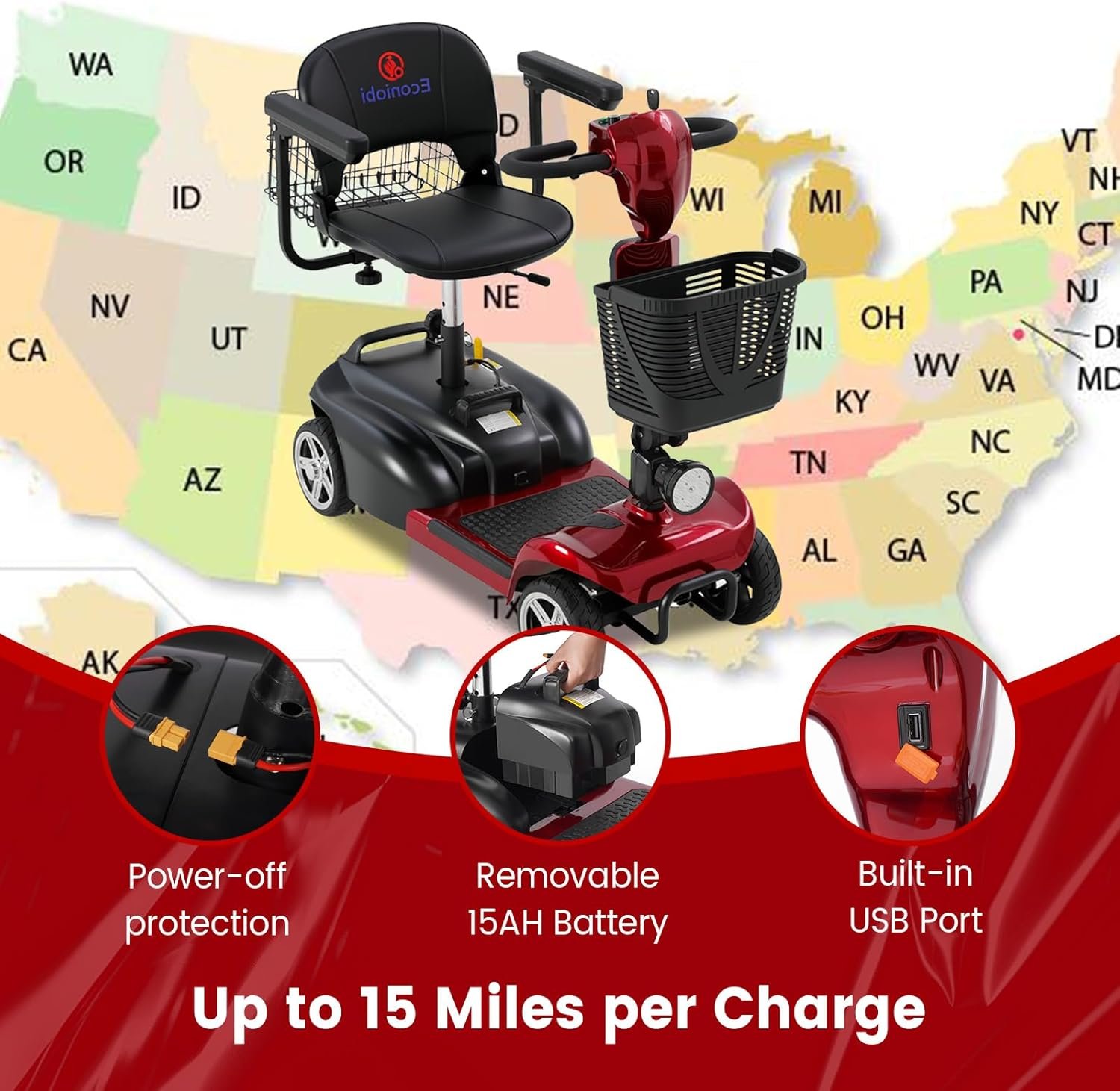 Detachable 15Ah Battery: Provides up to 15 miles of travel per charge. Removable battery allows safe, hassle-free charging anywhere.