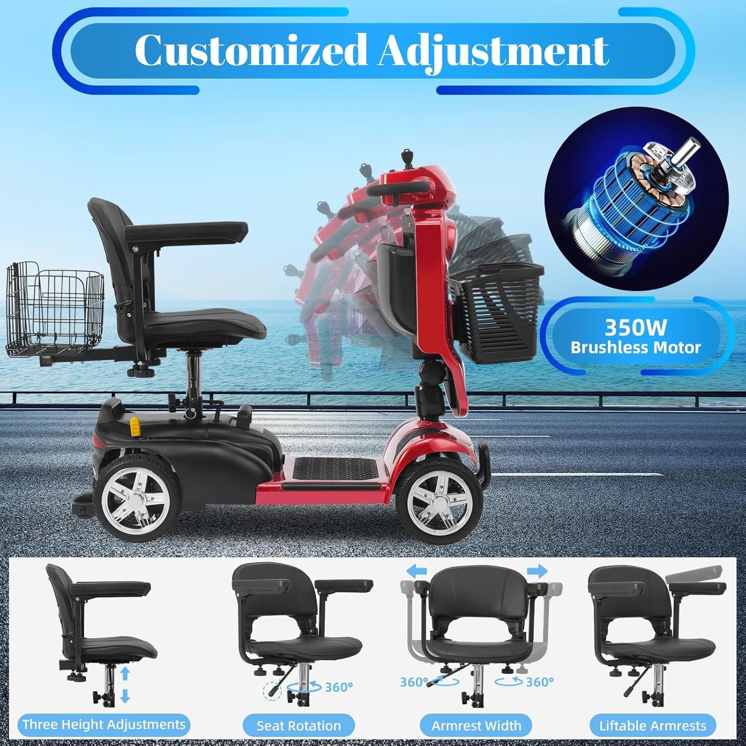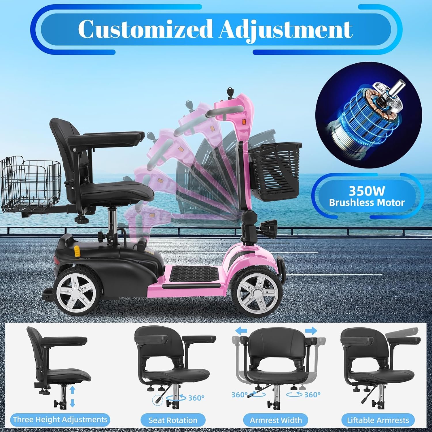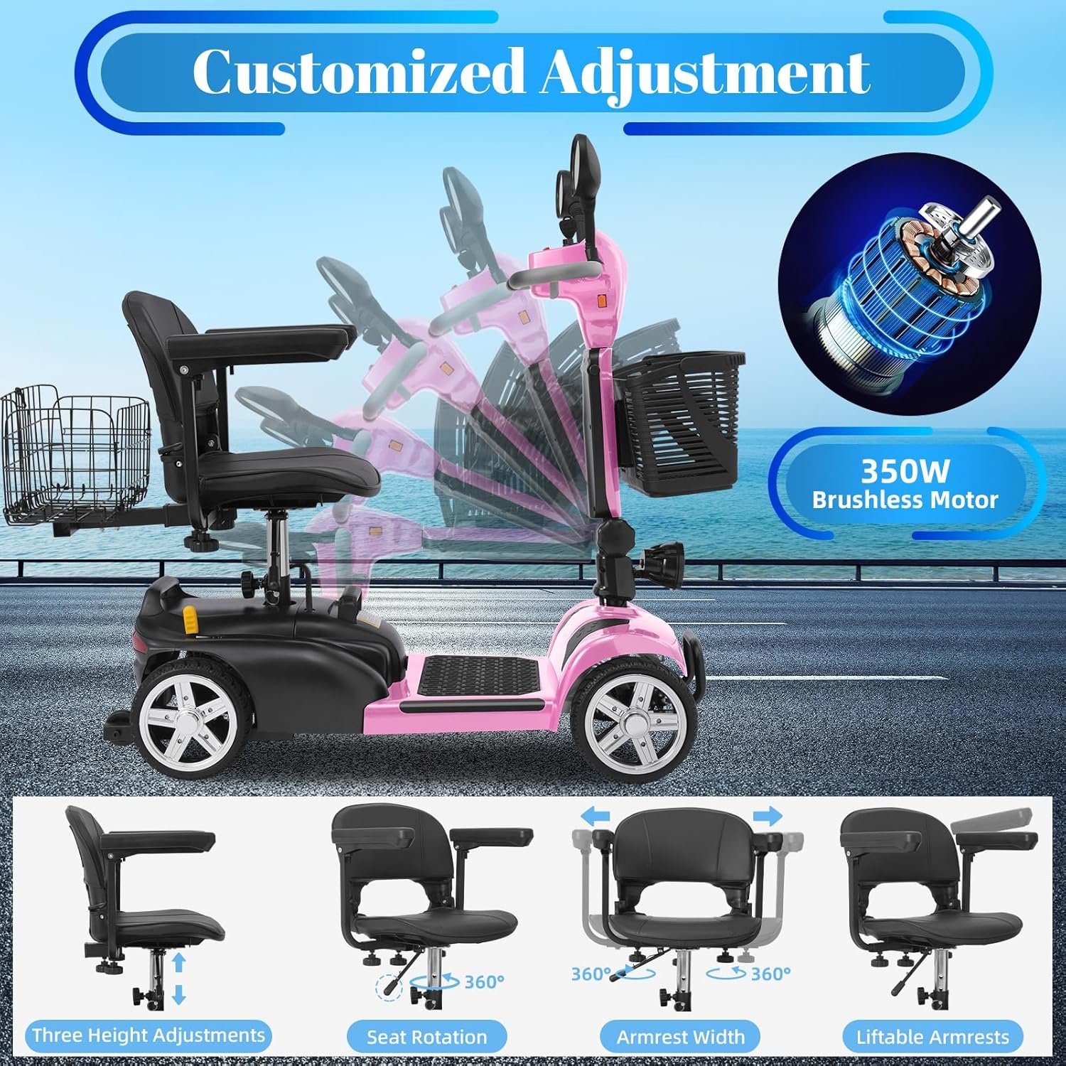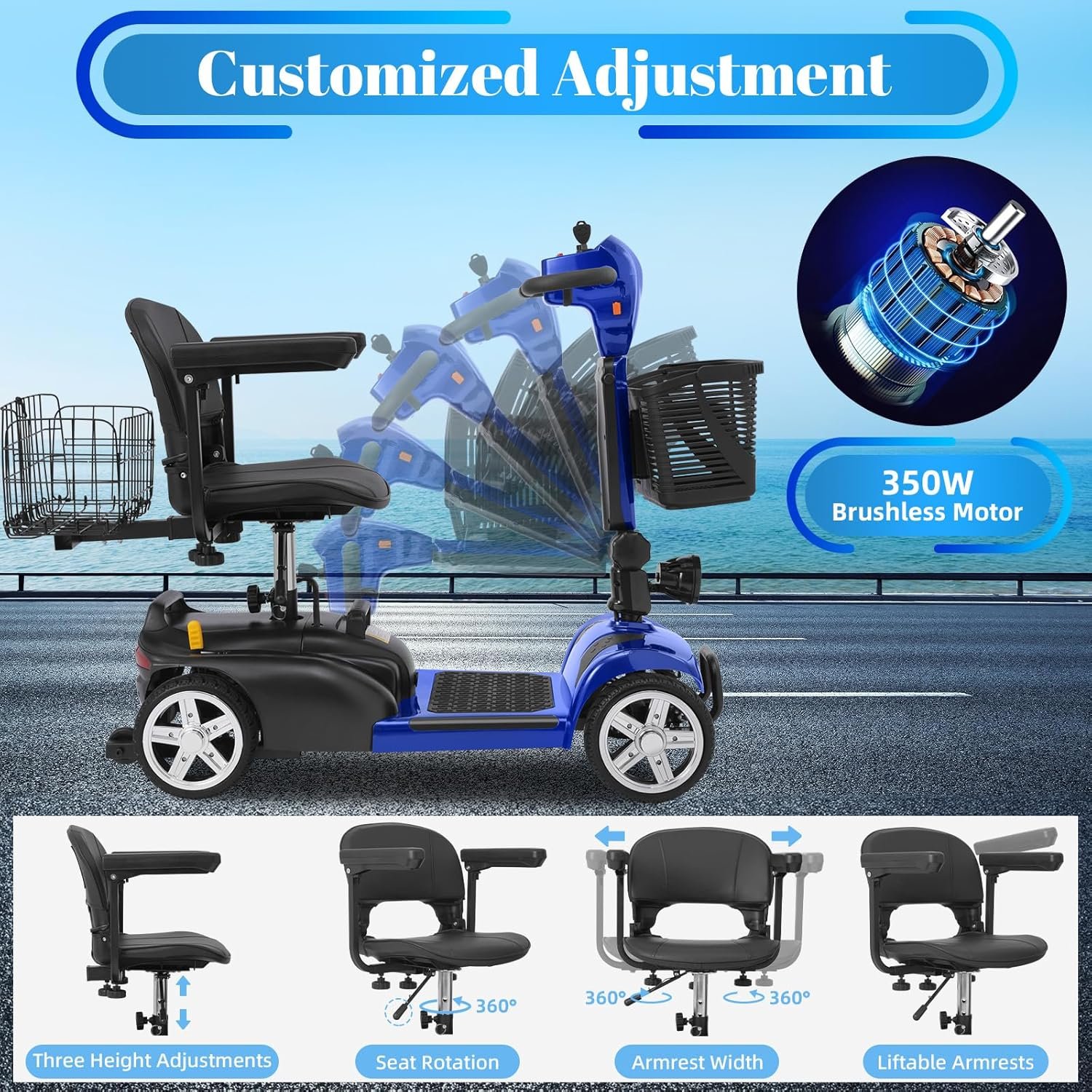 Powerful & Reliable Motor: 350W brushless motor delivers smooth acceleration; supports up to 300 lbs and top speeds of 7 MPH.