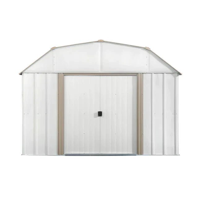 The shed has a has a baked-on enamel finish in eggshell and taupe to complement home exteriors.
