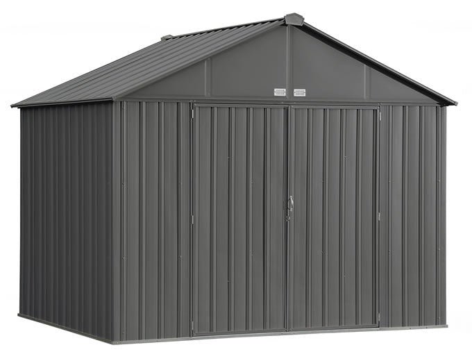 Introducing the EZEE 10×8 Shed from Arrow Storage Products a shed that builds in half the time. The EZEE Shed is a galvanized steel shed that is durable and made to last. It features the revolutionary Snap-IT Quick Assembly system that cuts assembly time down by 50% compared to most steel sheds on the market today. The EZEE Shed has a reduced number of fasteners across walls, roof, and doors so assembly is faster and easier! The EZEE Shed features a design that is 2x stronger than leading steel sheds on the market. Its unique panel geometry is more impact resistant, and with its overlapping Snap-IT panels that connect every 12 in., it boasts a stronger overall building design. The EZEE Shed also features improved roof assembly that allows for ground assembly of the roof for easier and faster roof attachment. The EZEE Shed is not only a tougher shed with faster assembly, it’s a more modern and attractive take on outdoor storage sheds, too! The EZEE Shed is available in an updated color pallet that makes it a modern and stylish storage solution for backyard, patio, and garden areas. The EZEE Shed doesn’t just look better; it offers better storage space, as well. The EZEE Shed’s attractive swing door design allows for easier access to your items and features a heavy duty framed out design. The doors are set on 3 hinges for extra durability. The EZEE Shed is a strong and modern alternative to your standard backyard shed, and the next step up in steel shed assembly and design.