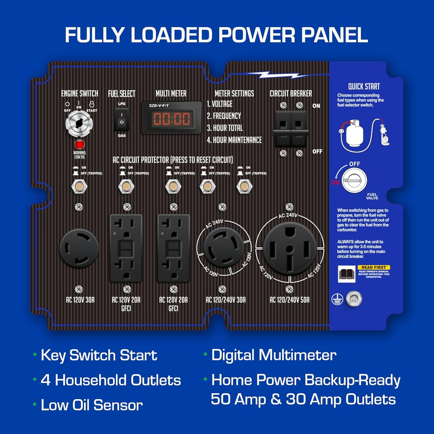 - The XP13000EH comes with a push button start, a front facing interface that allows you to change your fuel type in seconds, and a wide variety of outlets (including a transfer switch-ready 50 amp outlet)