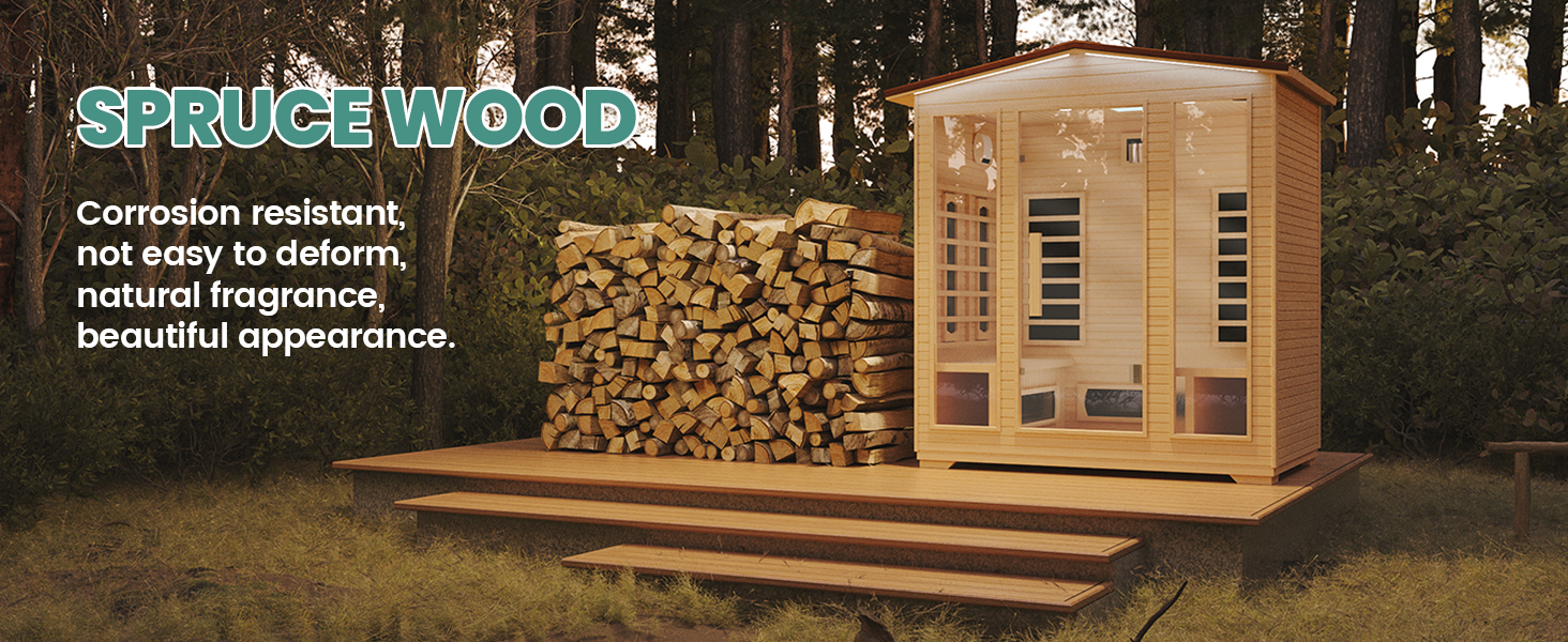 - HIGH QUALITY MATERIAL: Our 4 person sauna is made of high quality natural spruce wood and exudes the fragrance of natural wood. It has excellent water release and sun protection properties. The spruce wood used inside is the material used in most saunas. It has good insulation properties. There is no crack after heating.