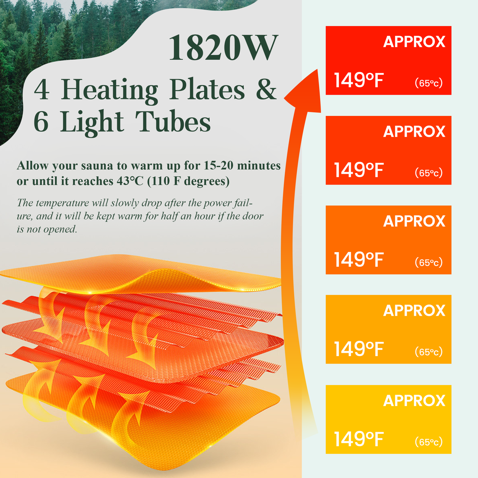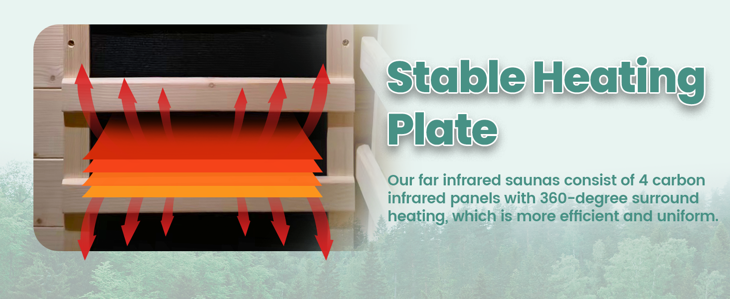 - UNIFORMLY HEATED: Our far infrared sauna consists of 4 carbon infrared panels and 6 light-emitting tubes heated around 360 degrees and can be heated for 15-20 minutes or until the temperature reaches 43 degrees Celsius (110 degrees Fahrenheit) and the temperature will slowly drop after the power is turned off, and it will be kept warm for half an hour if the door is not opened.