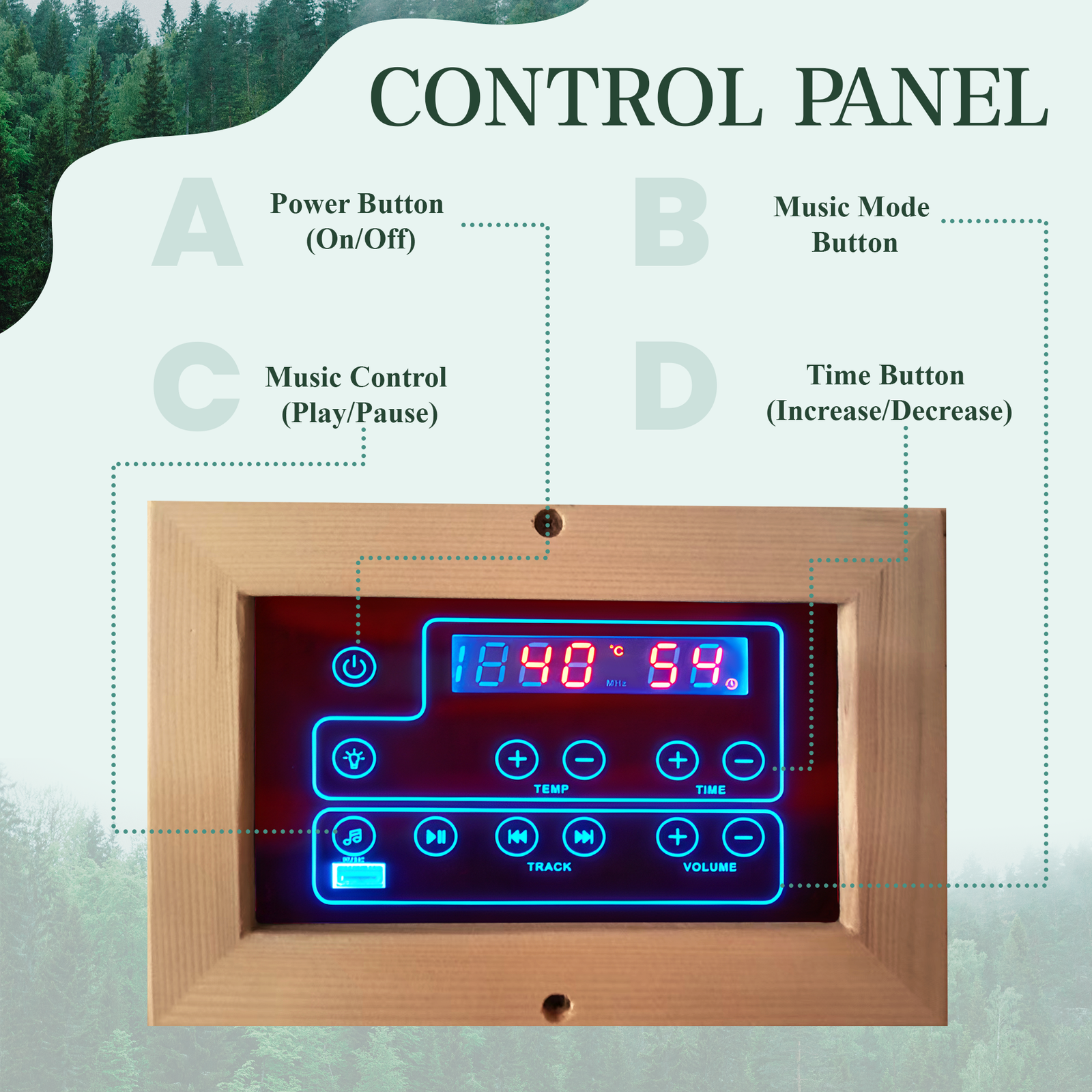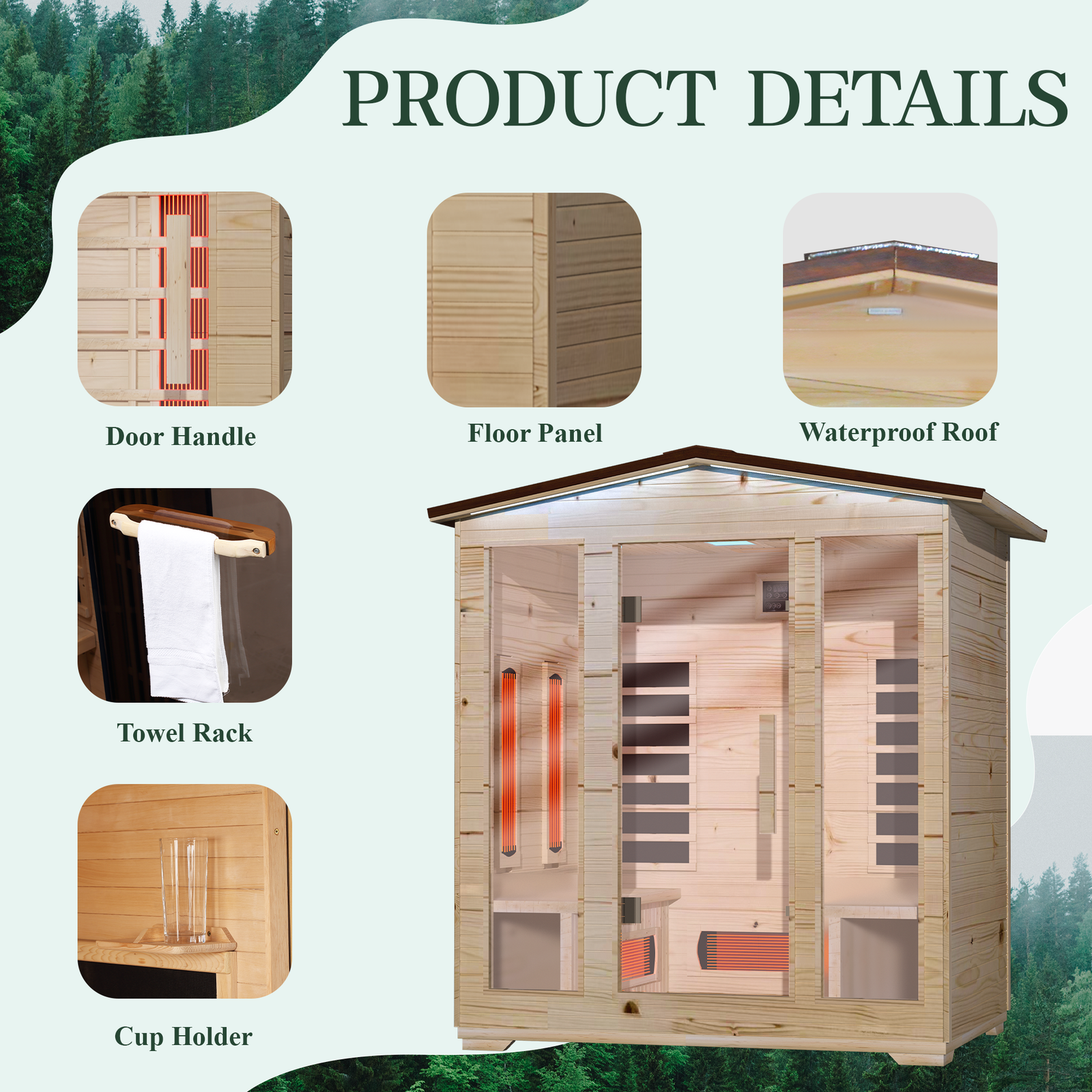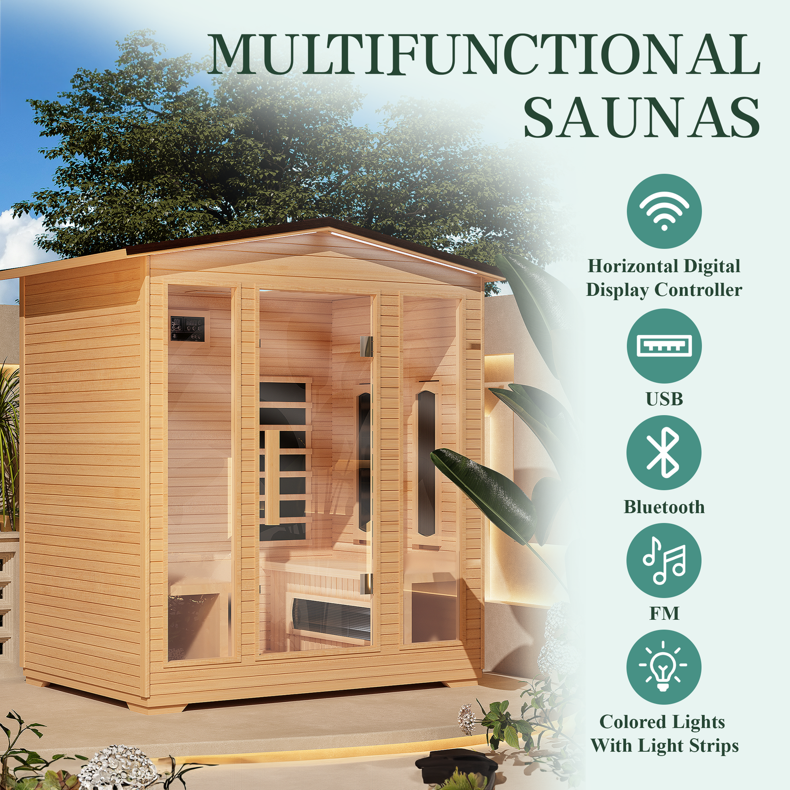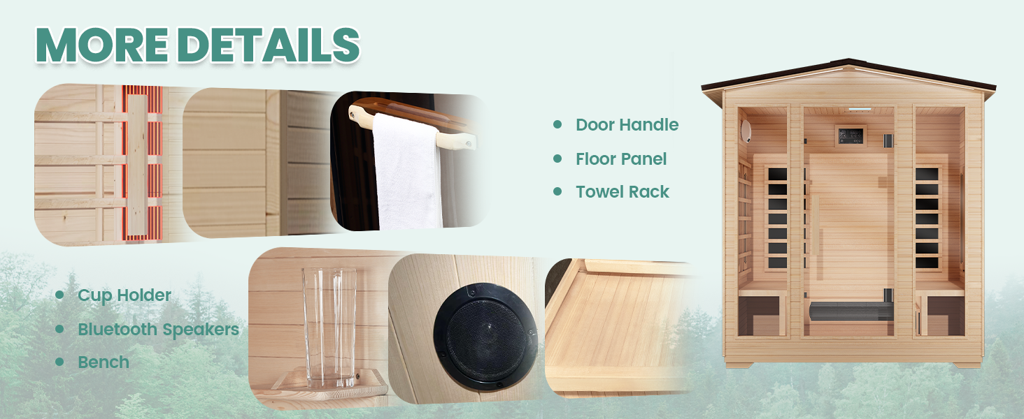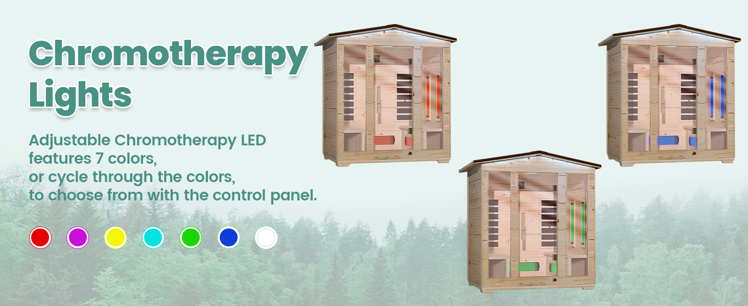 - MULTI-FUNCTIONAL DESIGN: This 4 person outdoor sauna is designed with Bluetooth for easier operation, excellent sound system allows you to enjoy the charm of backyard sauna and music at the same time, and 7-Colors Changeable Chromotherapy Lighting brings you an immersive experience.
