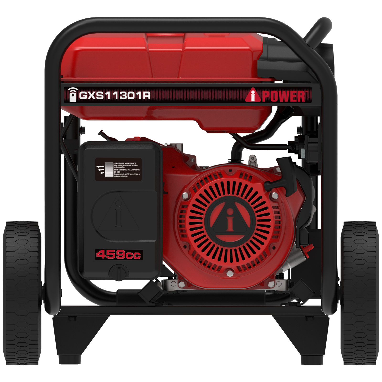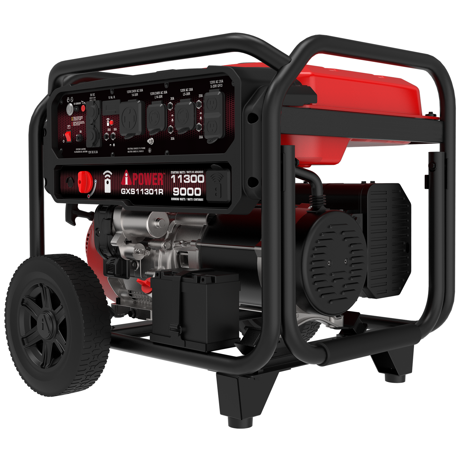 The A-iPower GXS11301R generator with a remote, with a performance series 459cc OHV engine, a cast iron sleeve, and low oil shutdown, has 11,300 starting watts and 9,000 running watts on gasoline. The 9.5-gallon fuel tank offers extended run time of up to 18 hours at 25% load. The unit is simple to starting, as it has recoil, electric, and remote start, with a fob and battery included.