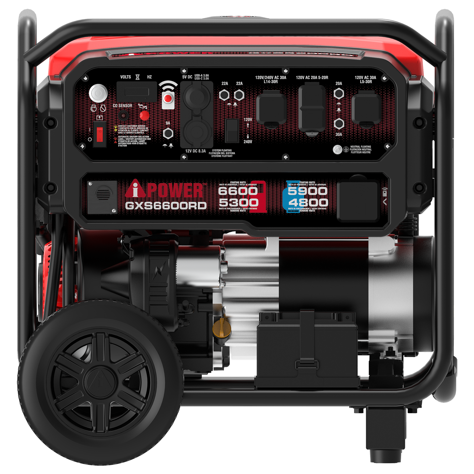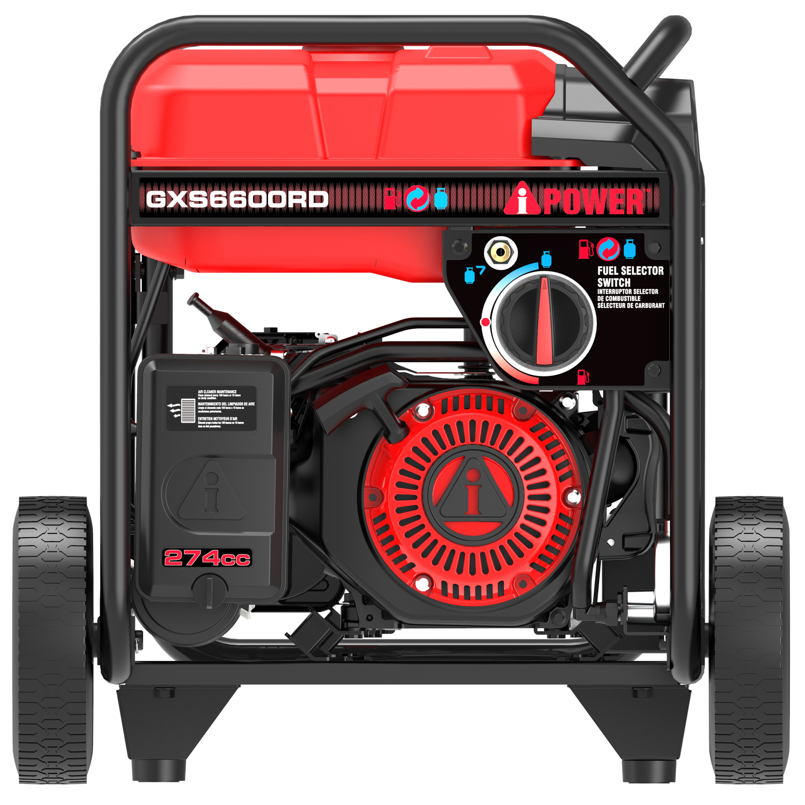 Featuring a 274cc OHV engine with cast iron sleeve and low oil shutdown, the GXS6600RD Remote Dual Fuel Portable Generator has 6,600 starting watts and 5,300 running watts on gasoline and 5,900 starting watts – 4,800 running watts on propane. It offers simple starting through recoil, electric, and remote start, plus a battery and fob is included.
