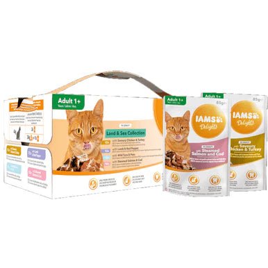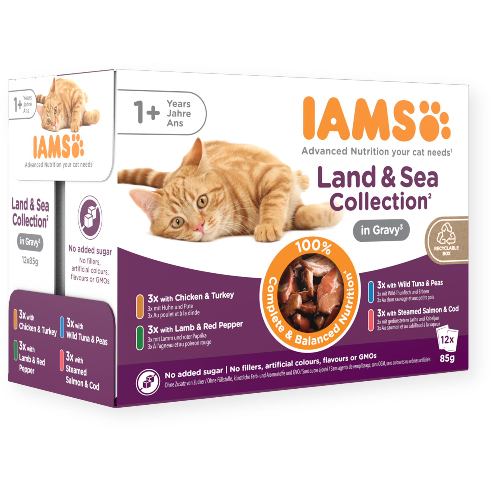 IAMS Adult Wet Cat Food Land Collection in Gravy is a multipack of complete wet food for adult cats. The selection includes meat-based recipes such as chicken and turkey served as tender pieces in gravy. Each pouch provides balanced nutrition suitable for daily feeding.