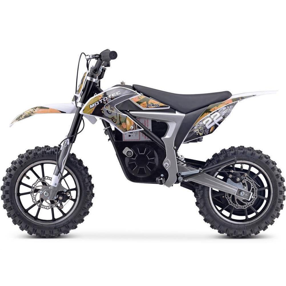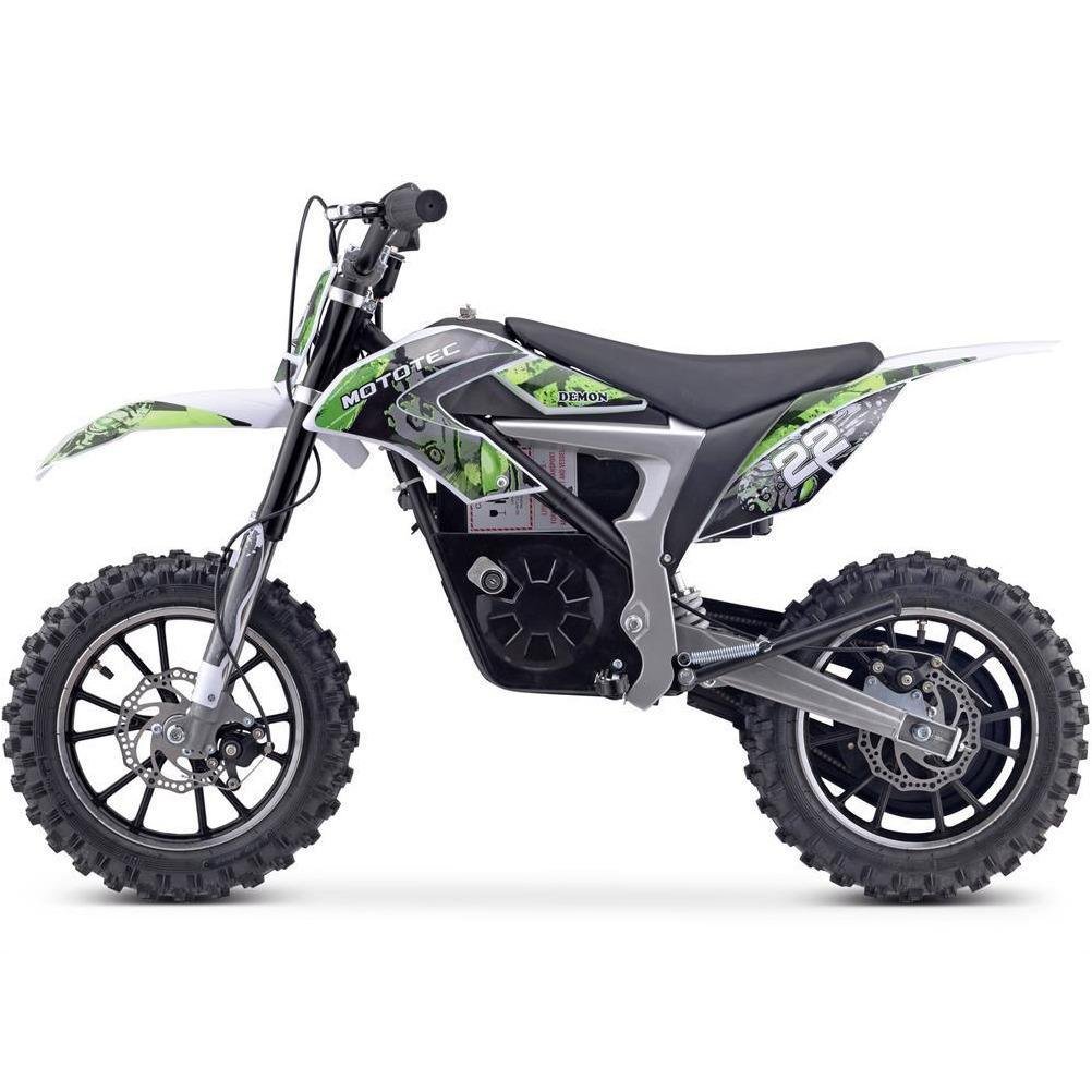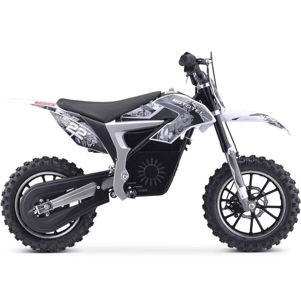 The MotoTec Demon Electric Dirt Bike is equipped with a powerful 500-watt electric motor, so you are sure it will kick dirt and accelerate quickly whenever you flick the throttle. This electric bike is fairly powerful for its size and can be used on hard and loose surfaces. Ride it and feel like a rockstar. This electric bike is recommended for students, teens, and sports enthusiasts. Always observe safety rules when riding this bike. The rider should wear a helmet and should ride only under constant supervision of an adult.