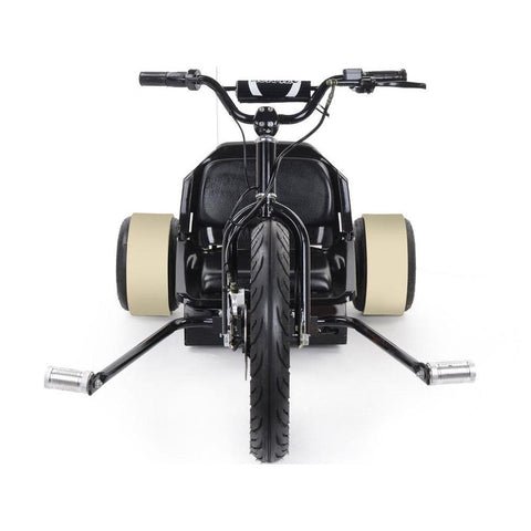 The Drifter Scooter is designed to actually drift. The scooter comes with free-wheeling rear wheels (with replaceable plastic covers) and a hydraulic disc brake, so the rear can fishtail once the speed is attained. Just accelerate and play with the brake and throttle to drift! If you want to use the MotoTec Drifter for trips, you can remove the plastic covers. The air-filled tires do an excellent job cushioning the ride and improving grip.