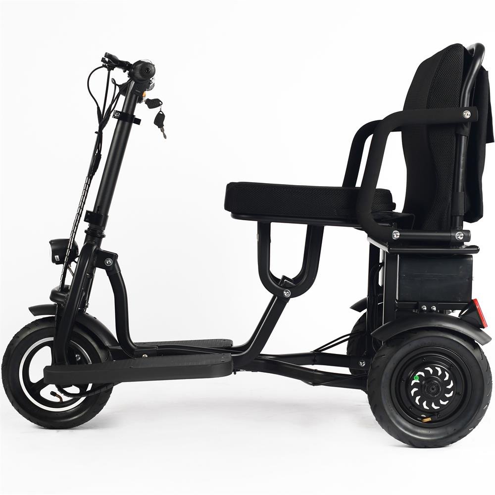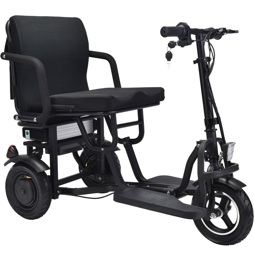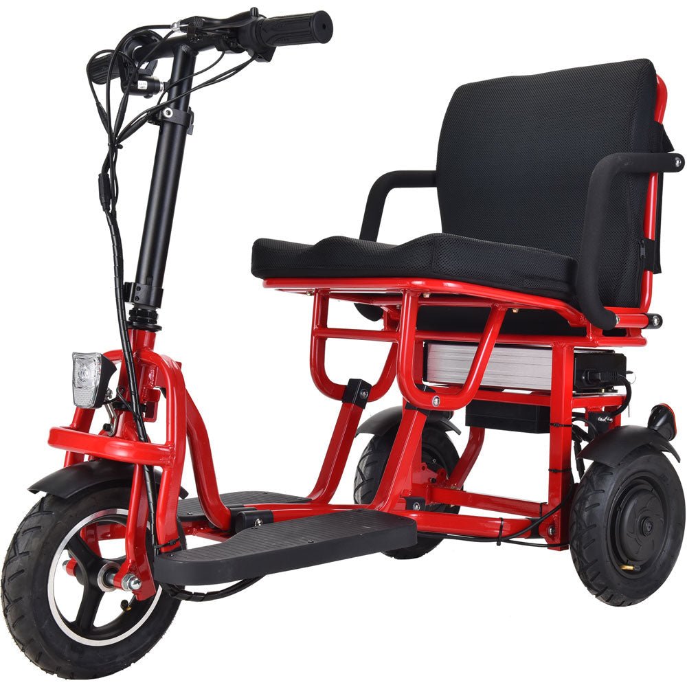 Introducing the new Folding Mobility Scooter by MotoTec. Its compact, three wheel styling makes for a sharp turning radius, 2 hub motors built into the rear wheels provide amazing torque for riding up inclines with its lightweight durable frame made from Aluminum. The lithium battery is lightweight and lasts longer than your standard lead acid competing models. Comes standard with headlight, rear reflectors, key start, reverse, dual rear drum brakes, comfortable seat with backrest, carrying bag and large 10 inch air filled tires to provide a comfortable ride.
