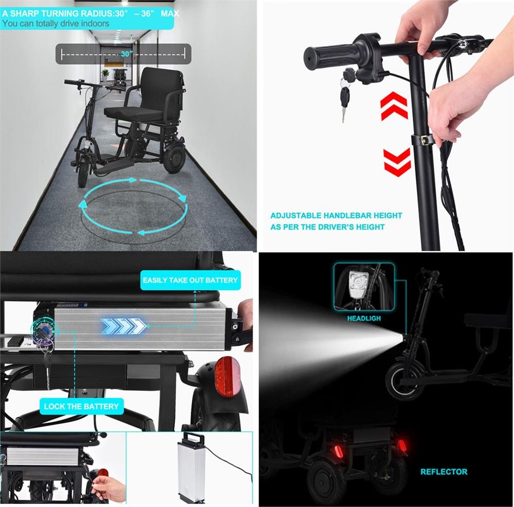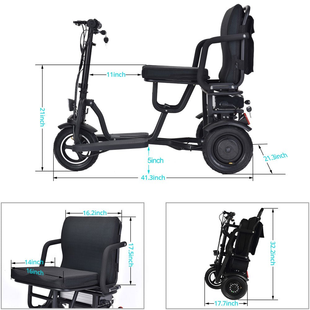Introducing the new Folding Mobility Scooter by MotoTec. Its compact, three wheel styling makes for a sharp turning radius, 2 hub motors built into the rear wheels provide amazing torque for riding up inclines with its light weight durable frame made from Aluminum. The lithium battery is light weight and lasts longer than your standard competing lead acid models. Comes standard with headlight, rear lights, key start, 3 forward speeds(with additional slow 1.5mph store speed), reverse, dual rear drum brakes, comfortable seat with backrest, front & rear baskets and large 10 inch air filled tires to provide a comfortable ride.