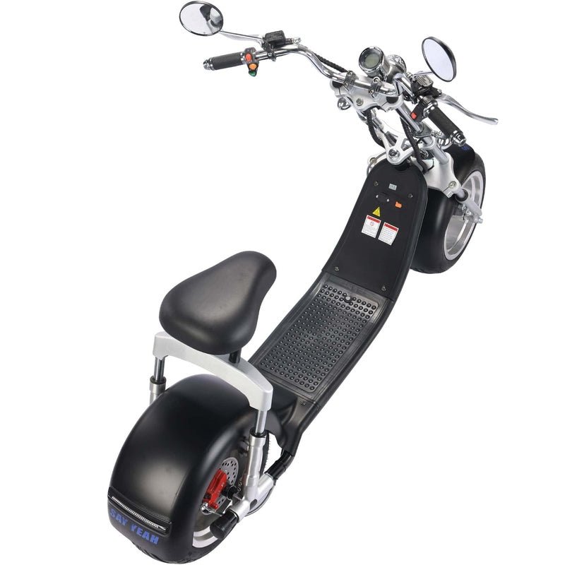 This powerful hub motor, powered by a 60v 20ah Lithium Battery can reach speeds of 30-35 mph and travel up to 30 miles per charge. Equipped with a Front LED headlight, Front Blinkers, Mirrors, Speedometer, Front & Rear Shocks, Front & Rear Hydraulic Brakes and Hugh Tires. This scooter is ready to tackle any terrain.