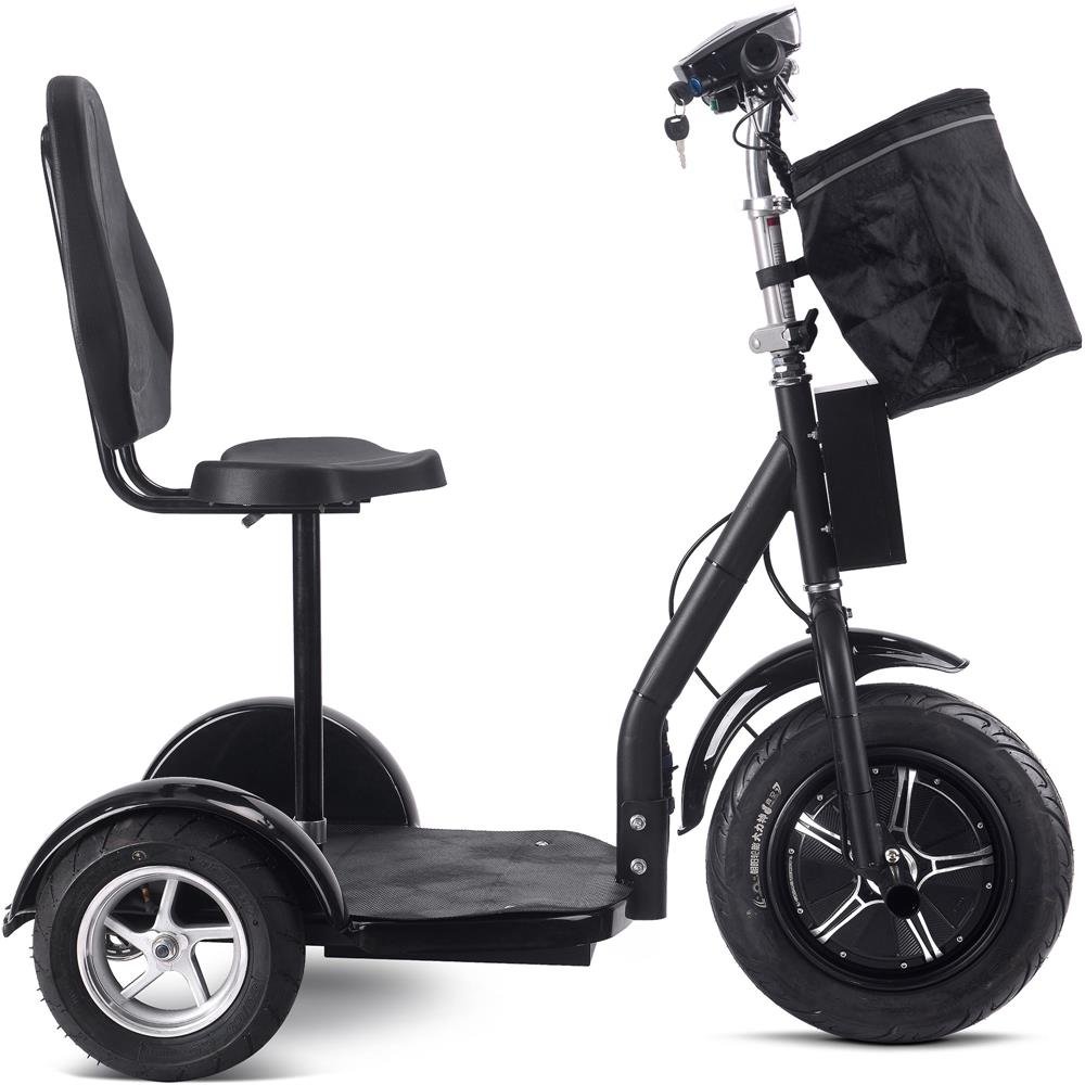 The MotoTec 48v 1000 Watt Electric Powered Trike aka Personal Transporter is a three wheel electric scooter that you can ride while sitting or standing, this makes it very convenient for use at events, security and warehouse floor operations or for just plain fun! It’s like a three wheel Segway but at a fraction of the price! Powered by a 1000 watt front wheel hub motor with speeds up to 28 miles per hour. It can achieve a 20-25 mile range on a full charge with it’s light weight Lithium Battery Pack. It features a 16″ pneumatic front tire, two 12″ pneumatic rear tires, a removable seat with backrest. This personal transporter is easy-to-operate with a twist throttle and front drum brake. Comes standard with key, foot pegs, battery meter, front LED head light and carrying basket.