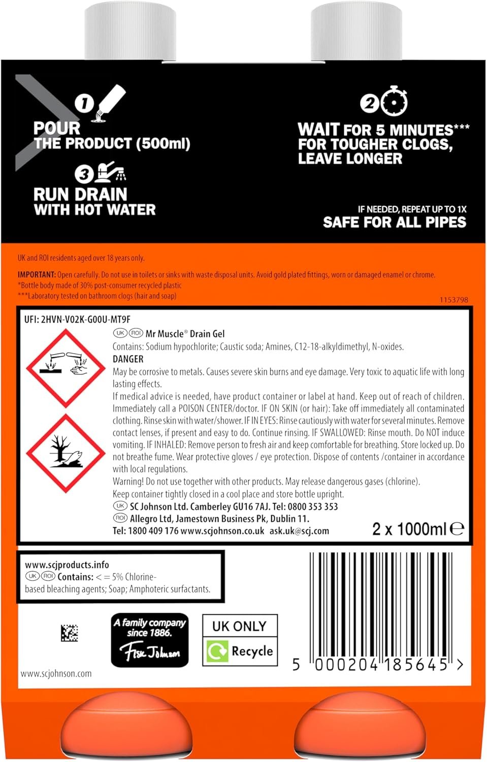 Mr Muscle Drain Unblocker, Sink & Drain Cleaner – Duo Pack (2 x 1L)
