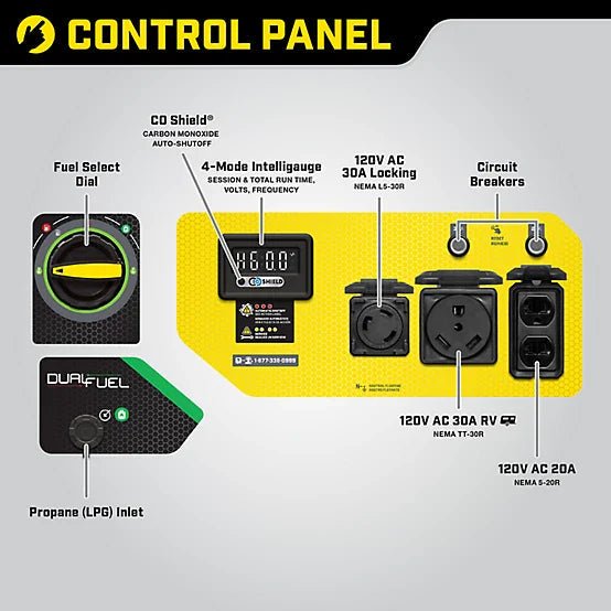 - Keep track of voltage, frequency, session run time, and total runtime hours to easily monitor output and track maintenance intervals, plus features CO Shield carbon monoxide auto shutoff system