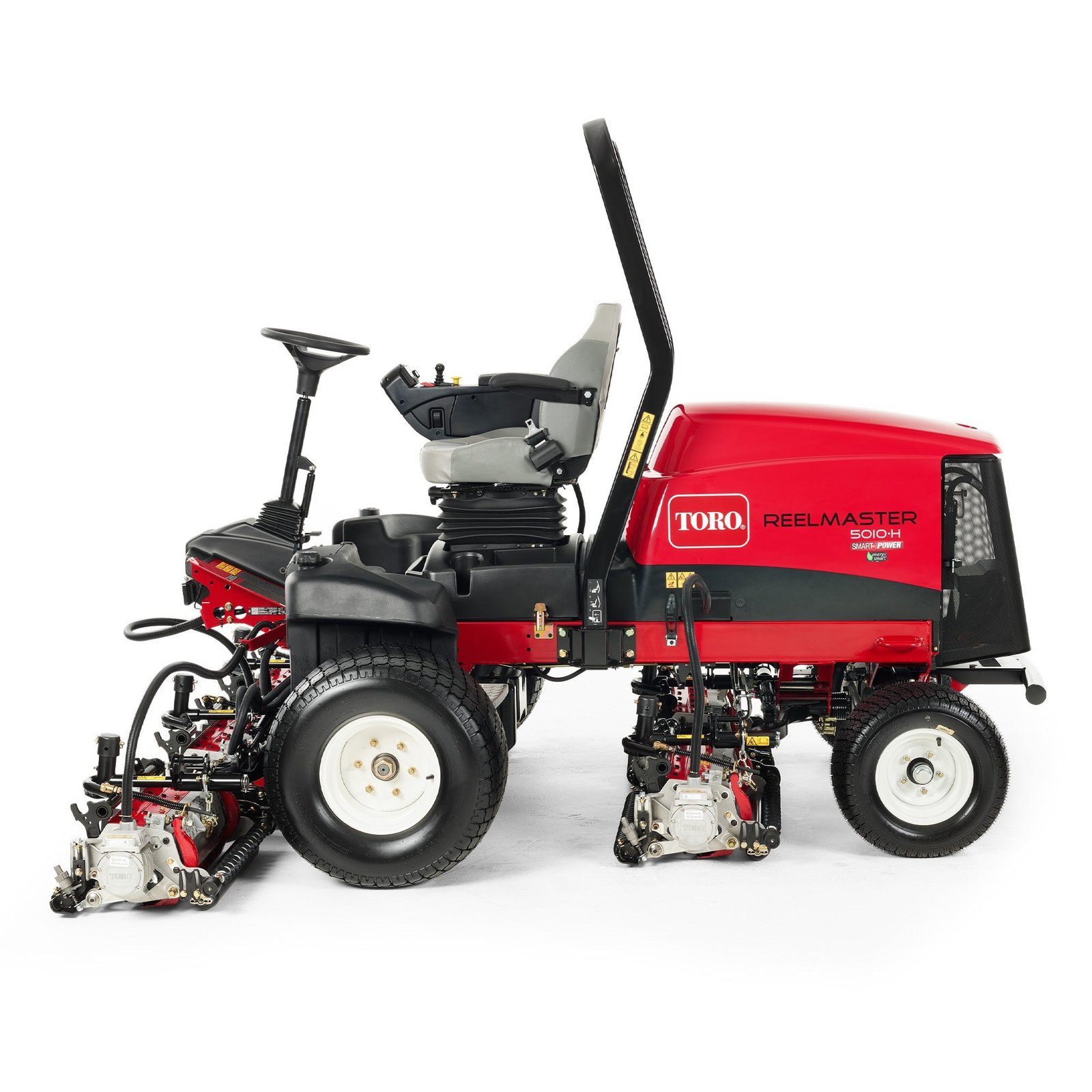 The Reelmaster® 5010-H is the industry’s first and only reel mower with a true hybrid drive system. The Reelmaster 5010-H utilizes a Kubota 22.9 hp (17.1 kW) diesel engine in concert with an in-line motor generator and a self-recharging 48-volt battery pack to provide seamless power to the vehicle and cutting units. The combination of these two power sources comprises Toro’s patented hybrid power delivery system called PowerMatch™. PowerMatch enables the Reelmaster 5010-H to match the power generated to the power required for all cutting conditions. The result is the availability of over 40 horsepower, but only when cutting conditions require it, which saves on average 20% fuel usage, improving operating costs, and the vehicle’s carbon footprint.= Hybrid Model