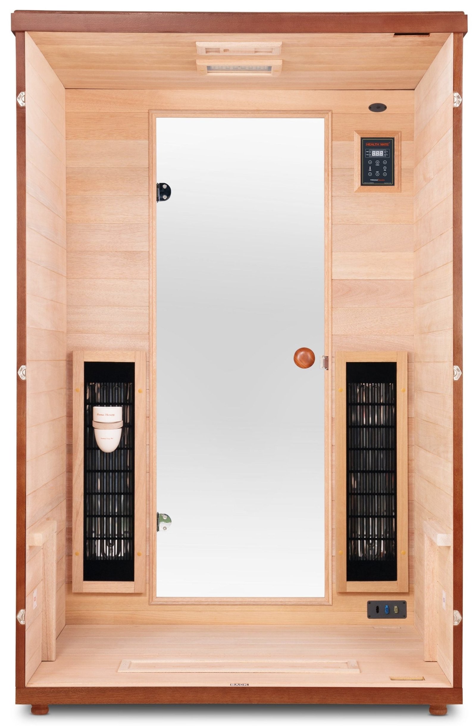 The Renew 2 Infrared Sauna seats two comfortably and offers the same durability and quality construction as our other models, but at a more affordable price. This inviting, two-person infrared sauna features our patented Tecoloy™ heaters, including floor heaters for added comfort, 48-diode chromotherapy lighting, inside/outside control panels, glass door, Bluetooth audio speakers, and much more. You’ll enjoy all the Health Mate infrared sauna desirable benefits and renewed health that a home sauna provides without breaking your budget. Requires no tools for easy assembly.