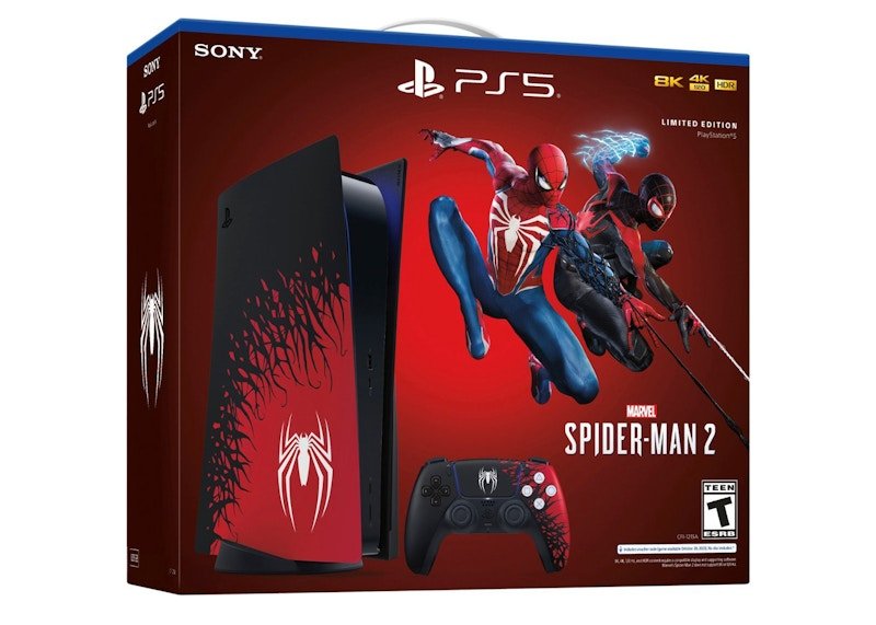 The Sony PlayStation 5 PS5 Blu-Ray Edition Marvel Spider-Man 2 Console Bundle (EU Plug) is a special-edition PS5 console bundle that features a Blu-Ray Edition of Marvel’s Spider-Man 2 game.This PS5 Spider-Man 2 bundle comes with a standard PlayStation 5 console with a Blu-ray disc drive (825 GB), 1 DualSense wireless controller, a voucher code for the digital version of the Spider-Man 2 game, an HDM1 2.1 cable, a console stand, a USB-A to USB-C type cable, and Astro’s Playroom (pre-installed game). The console and controller feature a custom Matte Black and Red Spider-Man 2 theme with a White Spider-Man logo. This console comes with an EU Plug.Something we love about this PS5 Spider-Man console bundle is its unique features and immersive gaming experience, which make it a perfect acquisition for fans of Marvel’s Spider-Man franchise. The Sony PlayStation 5 PS5 Blu-Ray Edition Marvel Spider-Man 2 Console Bundle (EU Plug) was made available on September 1st, 2023, for a retail price of $600.