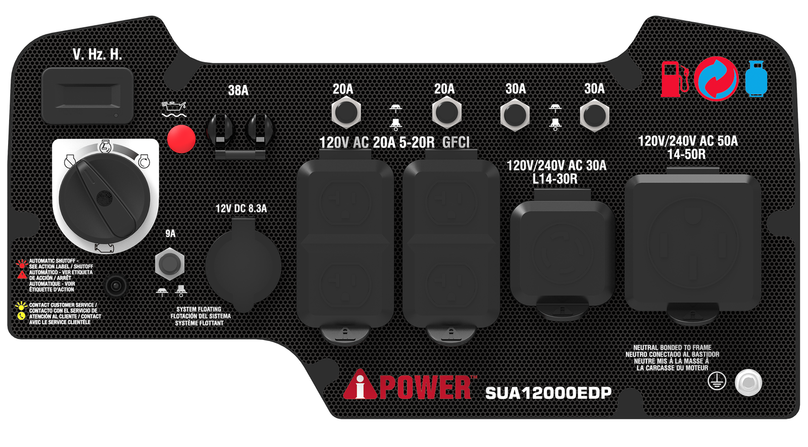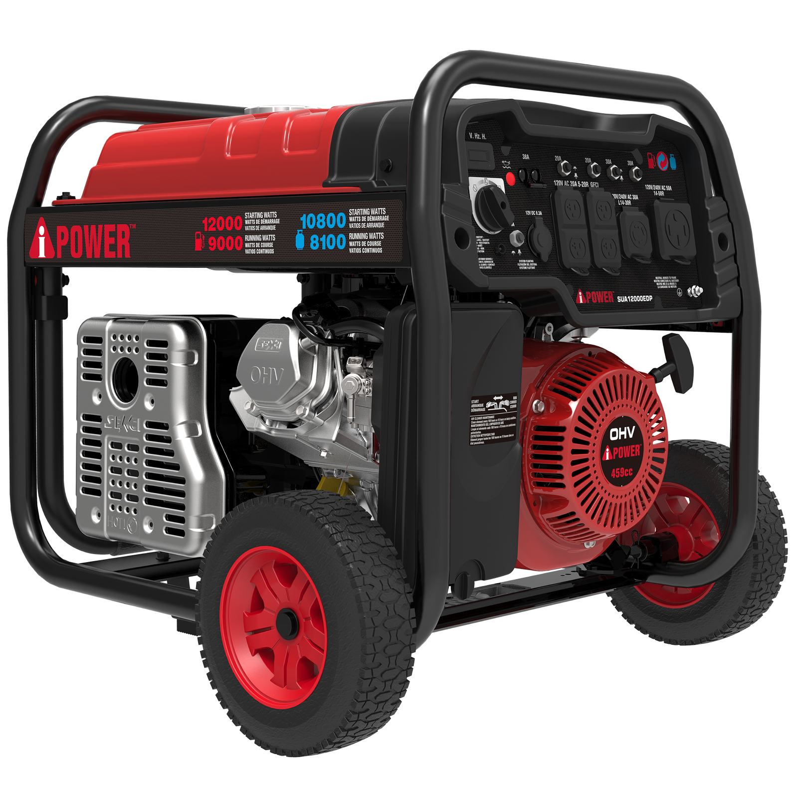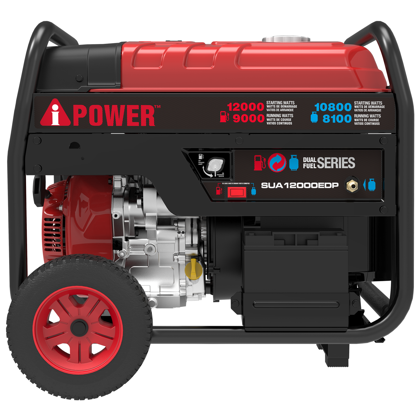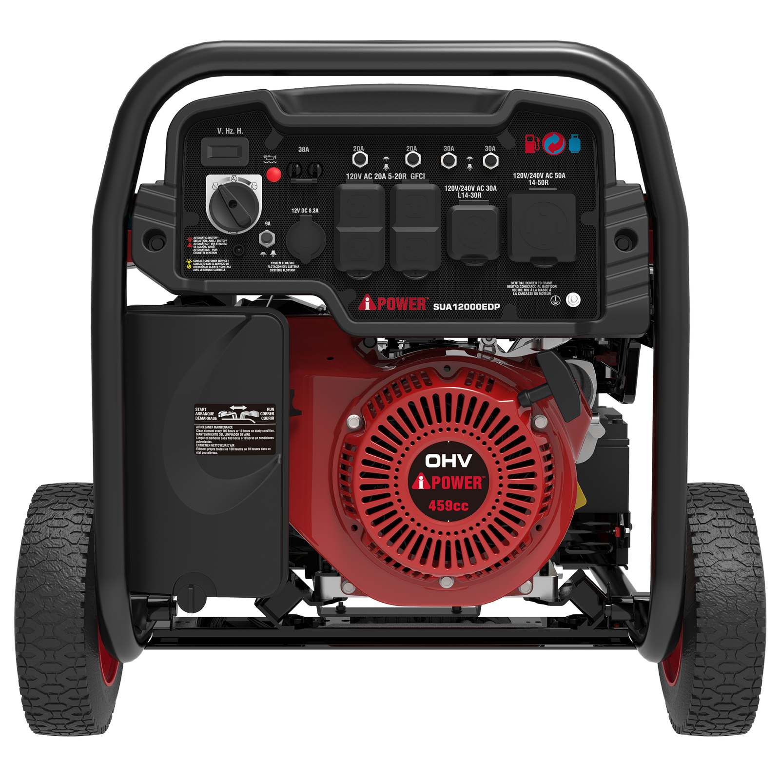 With a 459cc OHV performance series engine with a cast iron sleeve and low oil shutdown, the A-iPower SUA12000EDP Dual Fuel Generator offers 12,000 starting watts with 9,000 running watts on gasoline and 10,800 starting watts with 8,100 running watts on propane. The 6.6-gallon fuel tank has an extended run time of 14 hours at 25% load.