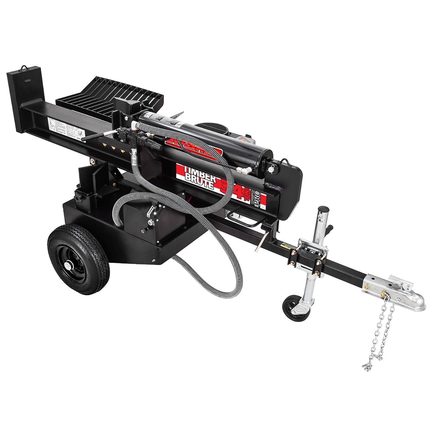 This splitter can function in both horizontal and vertical splitting positions so there’s no need to lift the big rounds, and the adjustable wheeled front stand allows for easier adjusting, hitching, and moving.