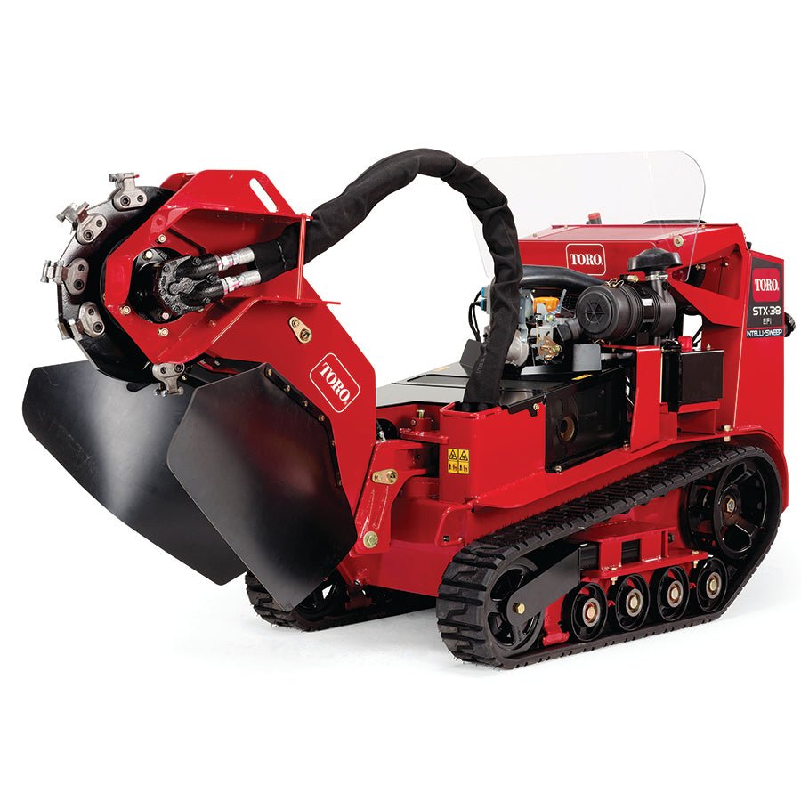 Toro® STX-38 Stump Grinder is built for outstanding durability in the toughest conditions. Fully hydraulic operation means no chance of expensive belts breaking or slipping and no tension adjustments. The Intelli-Sweep® feature automatically slows the sweep speed of the cutting head based on the load of the wheel, so heavy cutting loads won’t bog down the engine. And with easy-to-use TX-style controls and tracks for maneuverability and stability, the STX-38 is extremely operator-friendly. The STX-38’s electronic fuel injection engine provides less maintenance, easier starting, and improved performance. Best of all, ground speeds of 4.5 mph allow you to spend more time grinding — and less time transporting the machine — for greater productivity.